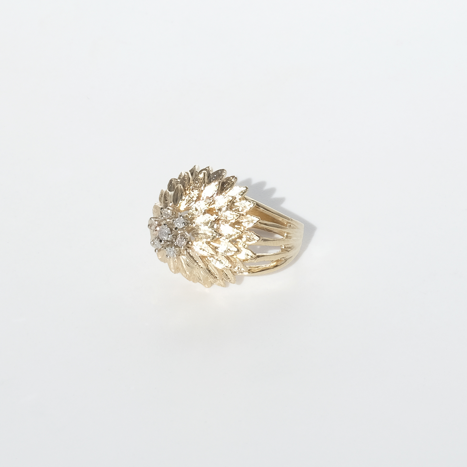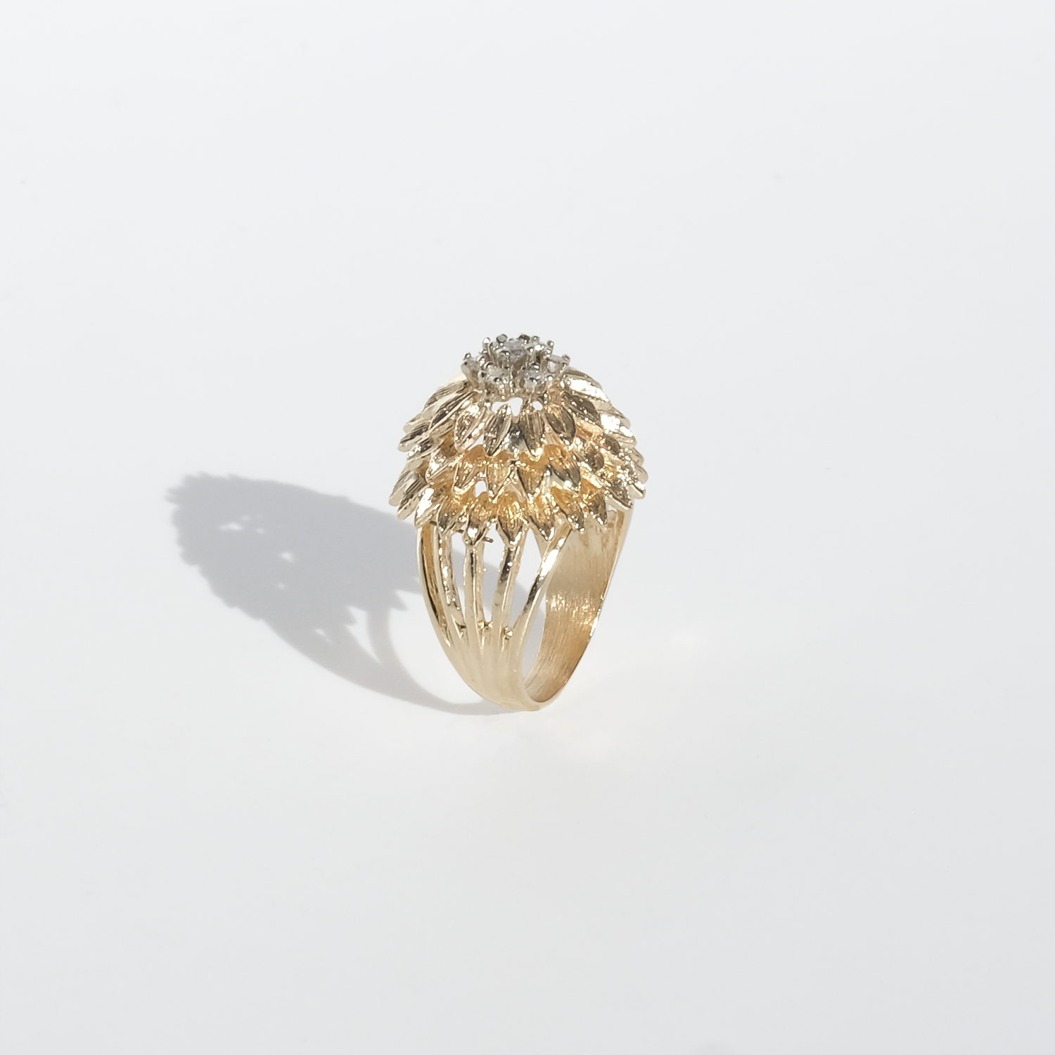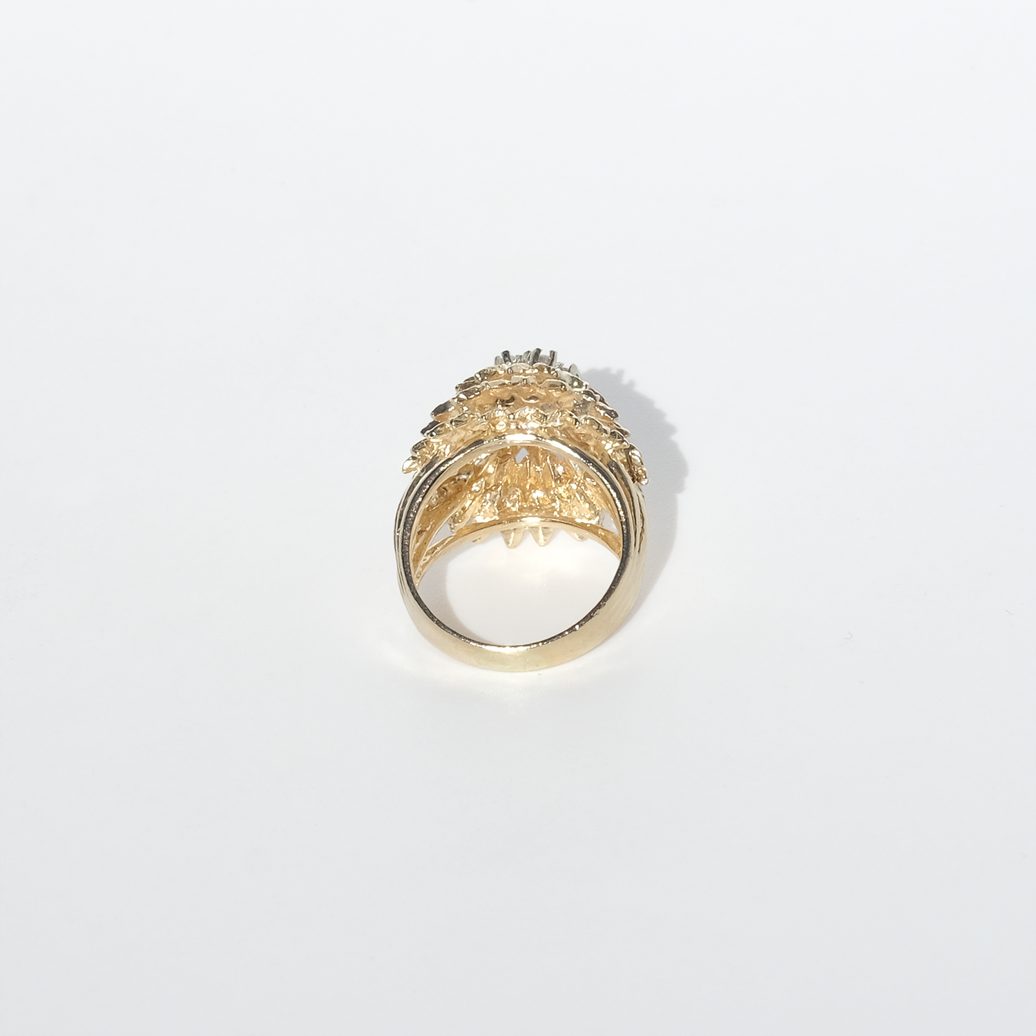 A vintage ring in 14 karat gold with a sculptural, domed top. The surface is built in three layered rows of textured, overlapping elements, resembling a stylised pine cone. Each layer is carefully shaped, creating depth and a soft play of light across the gold.