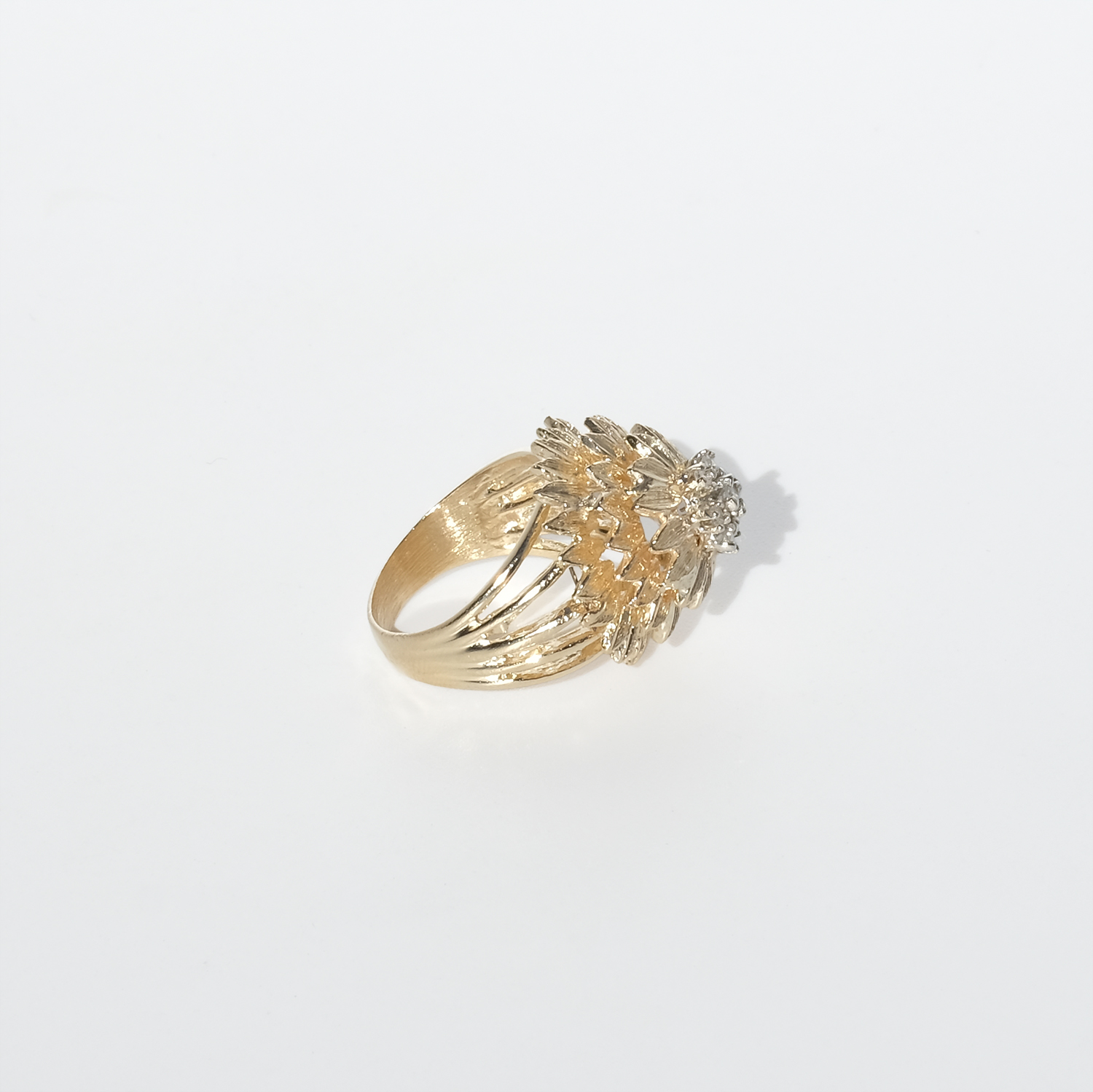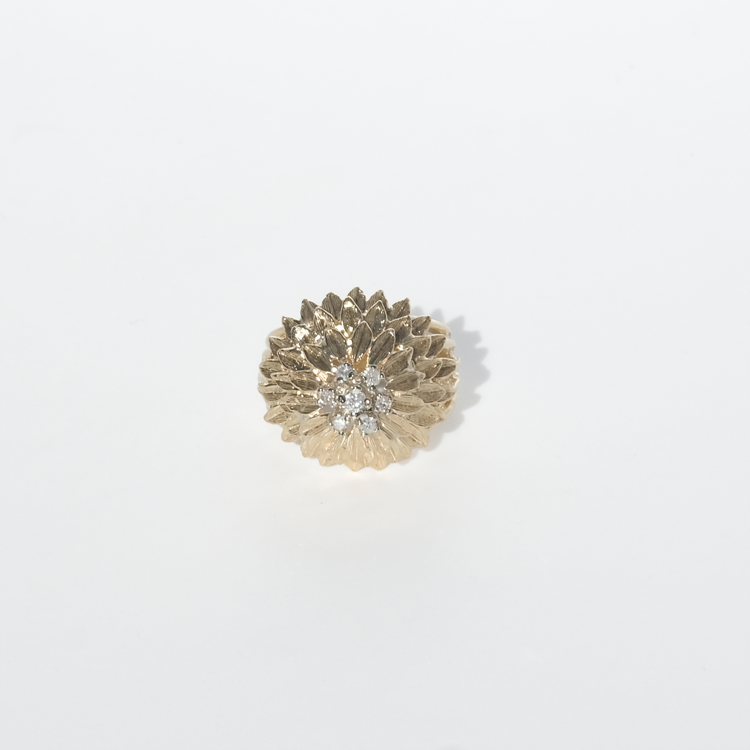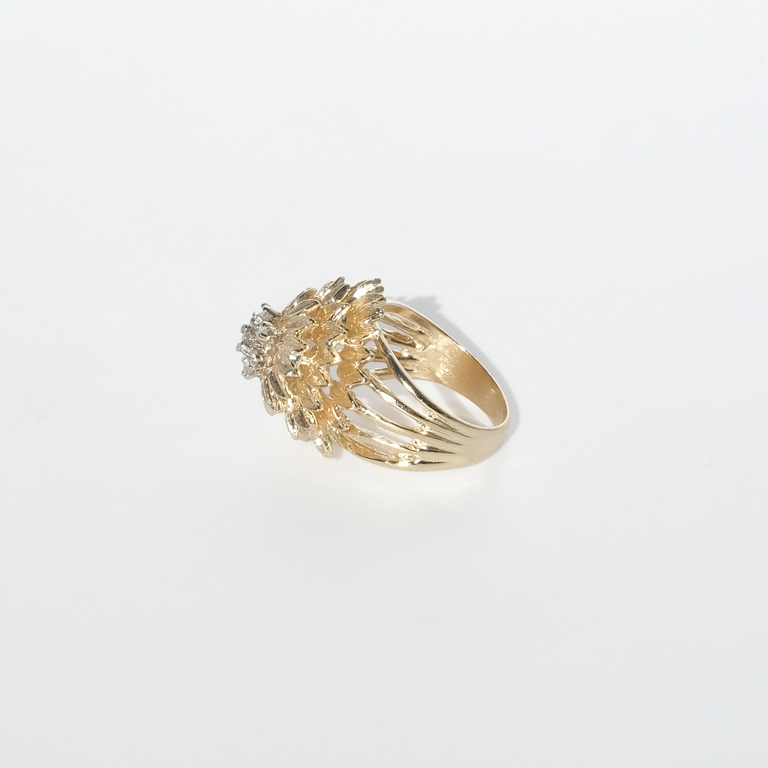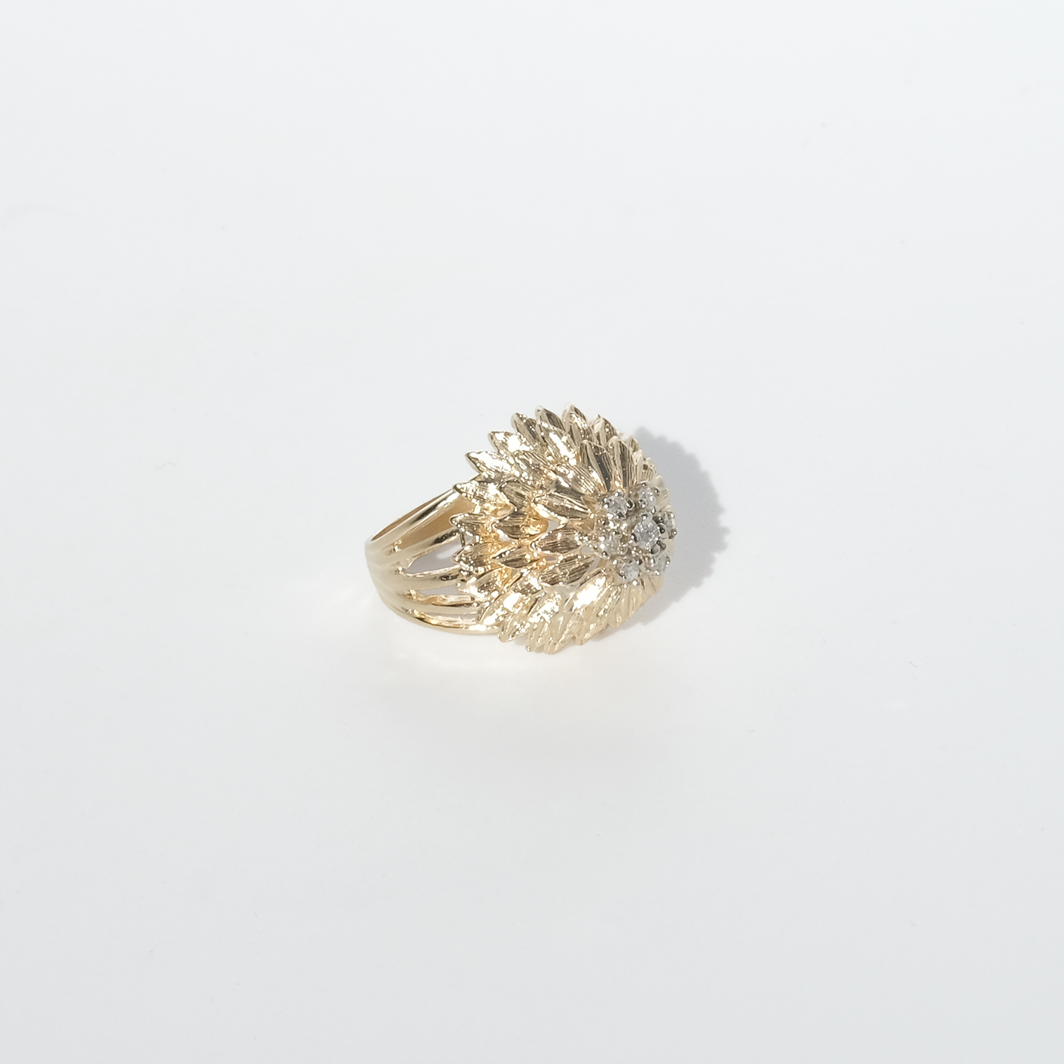 A vintage ring in 14 karat gold with a sculptural, domed top. The surface is built in three layered rows of textured, overlapping elements, resembling a stylised pine cone. Each layer is carefully shaped, creating depth and a soft play of light across the gold.