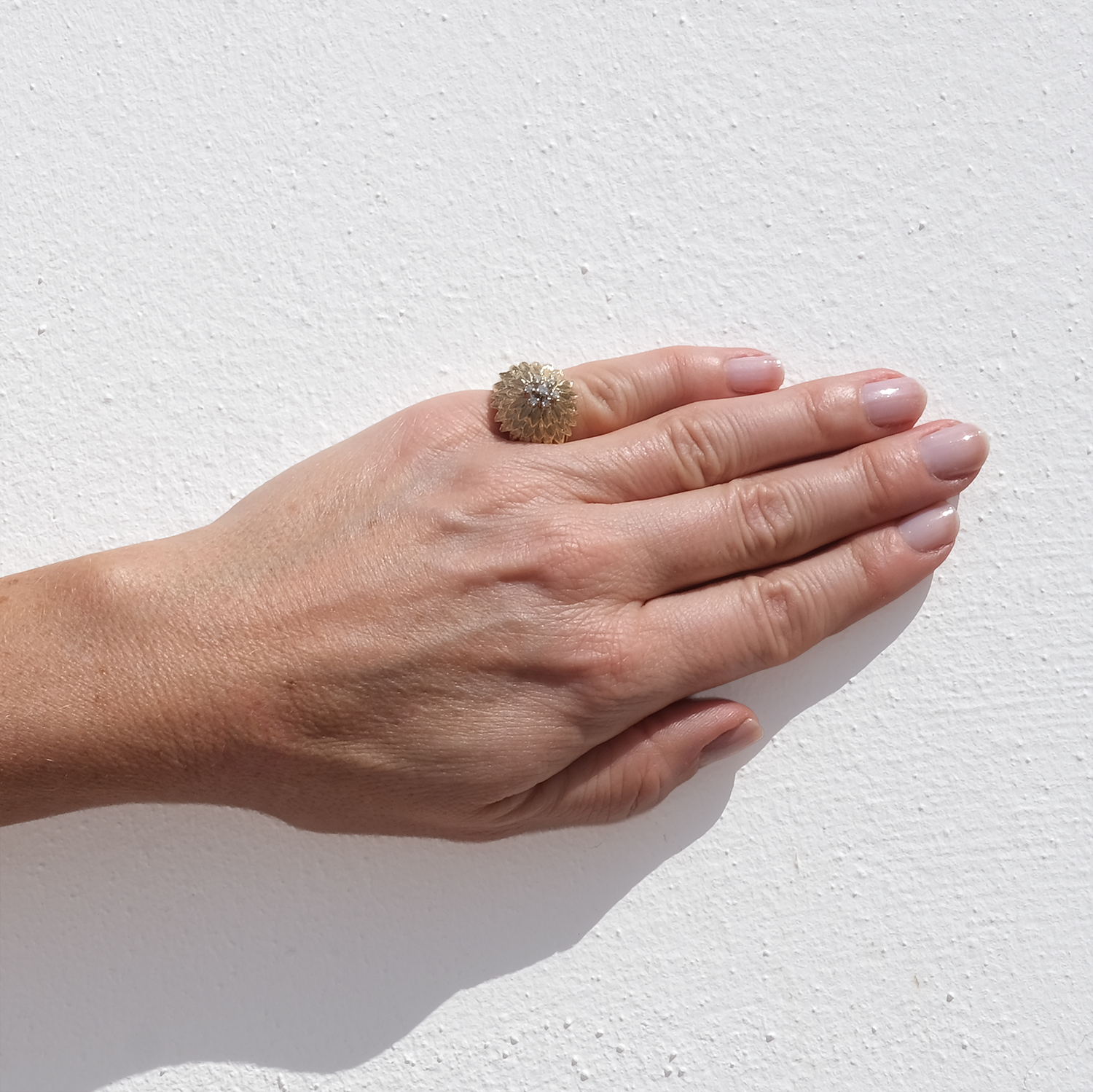 The ring has a tactile, almost organic character. Worn, it sits confidently on the hand—distinct yet easy to wear, like an everyday statement with a natural, sculptural edge.