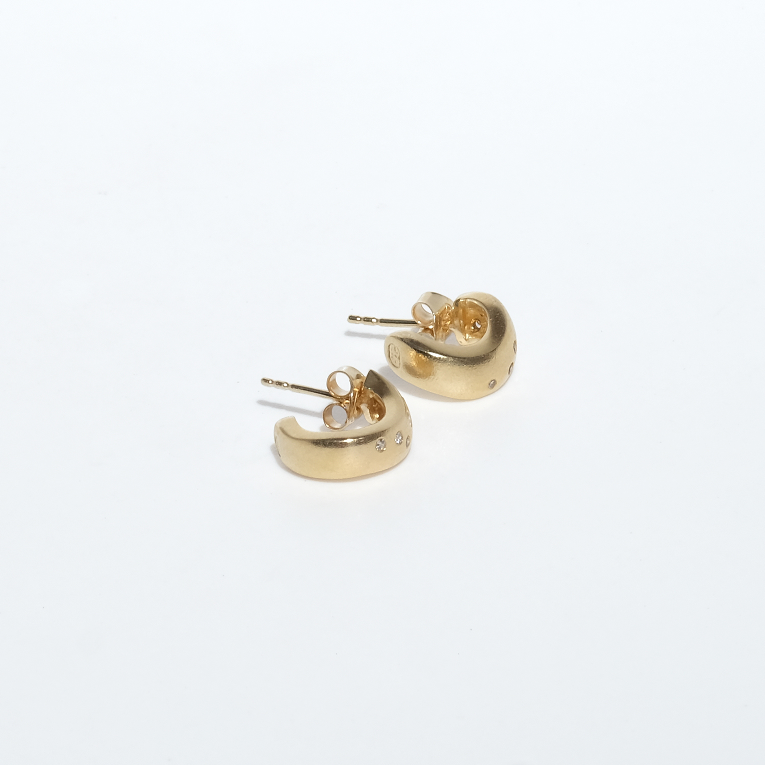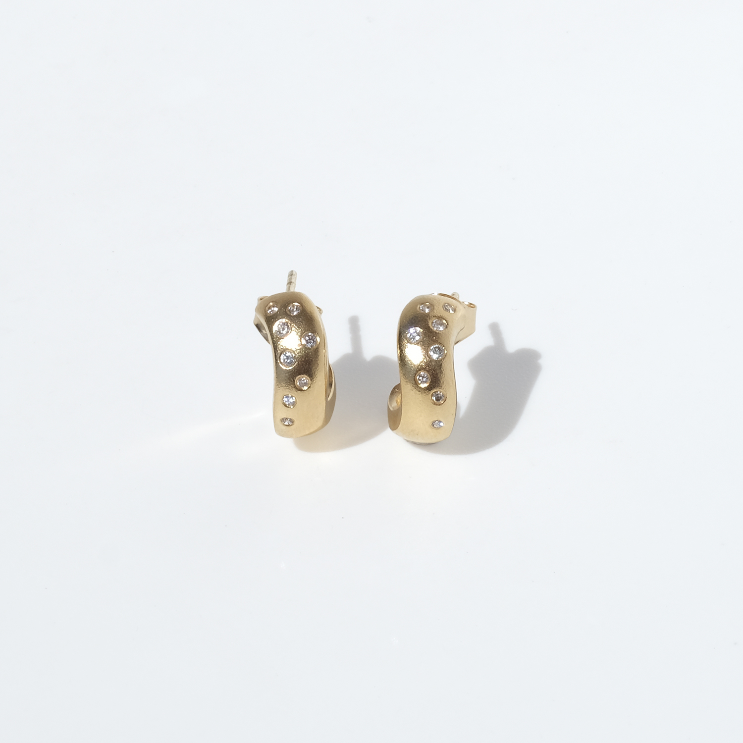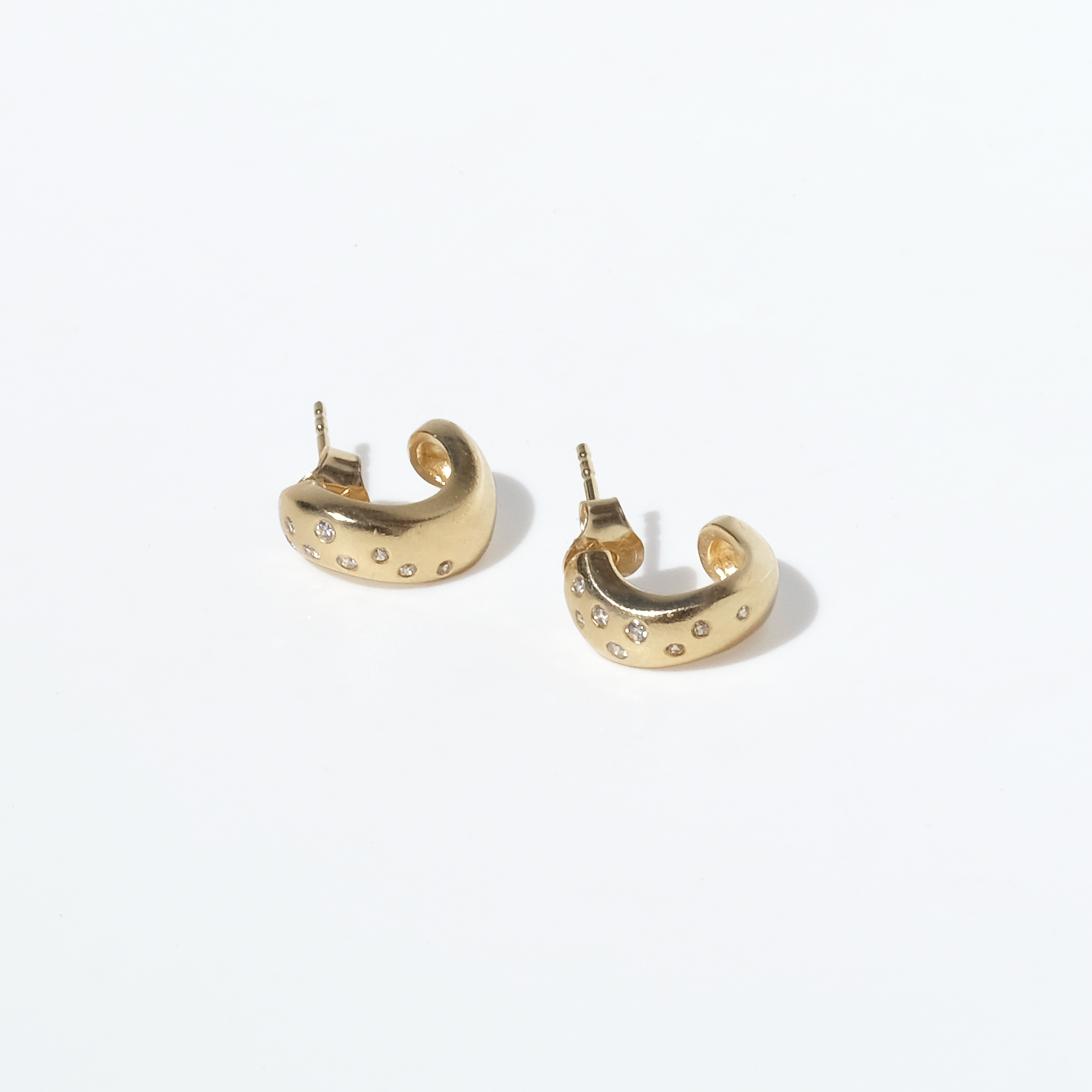 These 18 karat gold stud earrings are shaped as softly rounded half hoops, with a gently undulating, almost wave-like form that gives them movement despite their compact size. The body is full and smooth, in a warm yellow-gold tone. Each earring is set with eight small diamonds of varying sizes, scattered across the front in an irregular pattern that creates a lively, star-like effect. The stones are placed at different heights and distances, keeping the look organic rather than strict.