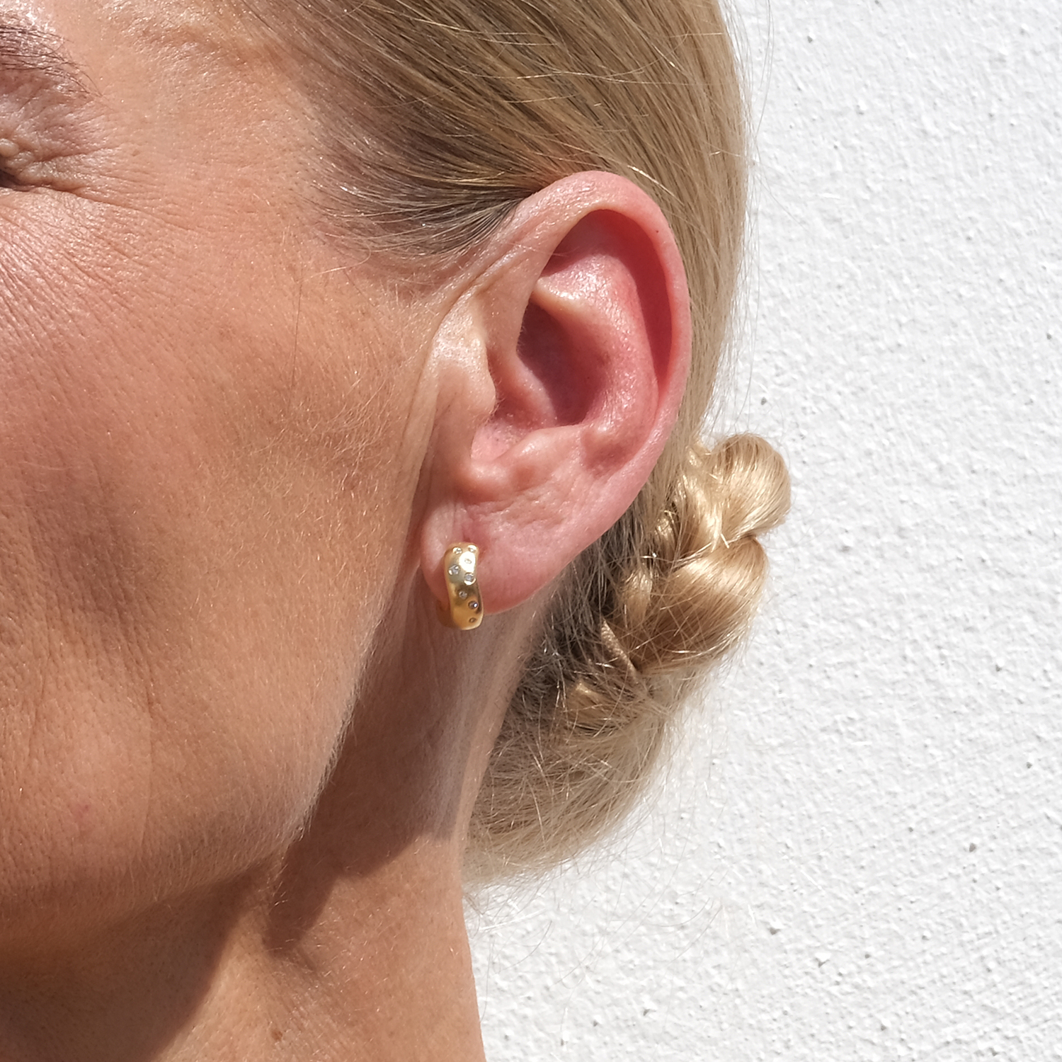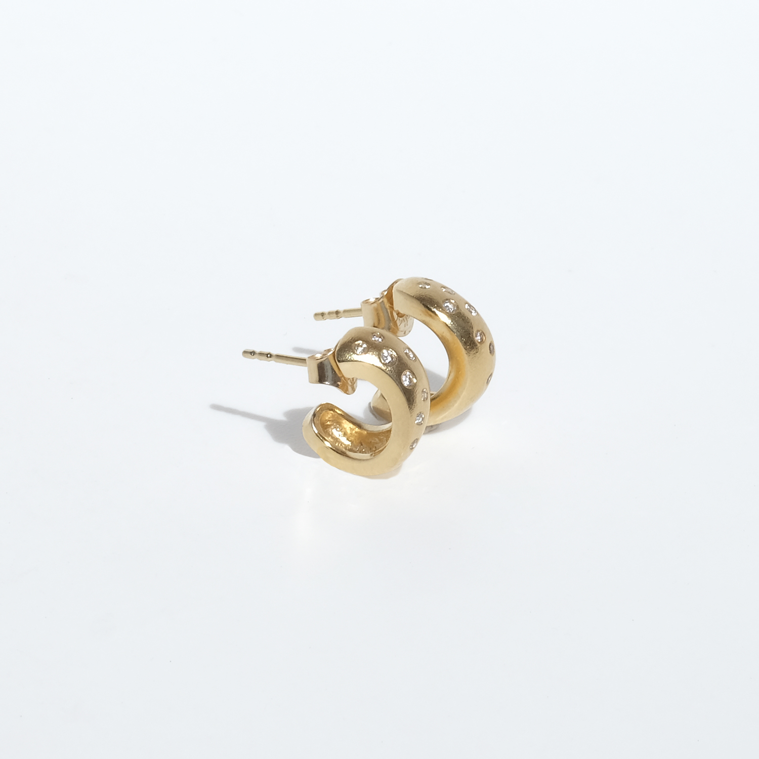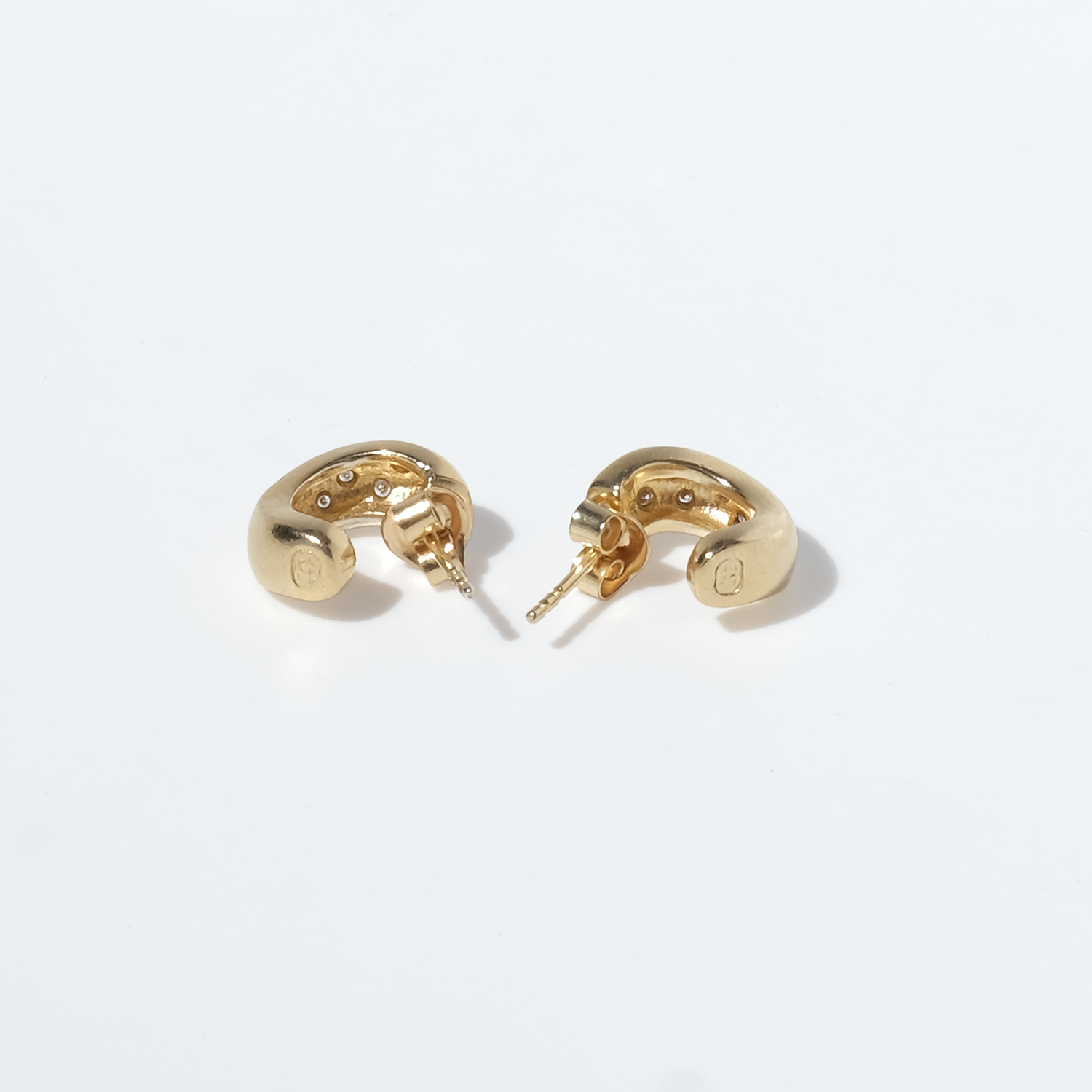 These 18 karat gold stud earrings are shaped as softly rounded half hoops, with a gently undulating, almost wave-like form that gives them movement despite their compact size. The body is full and smooth, in a warm yellow-gold tone. Each earring is set with eight small diamonds of varying sizes, scattered across the front in an irregular pattern that creates a lively, star-like effect. The stones are placed at different heights and distances, keeping the look organic rather than strict.