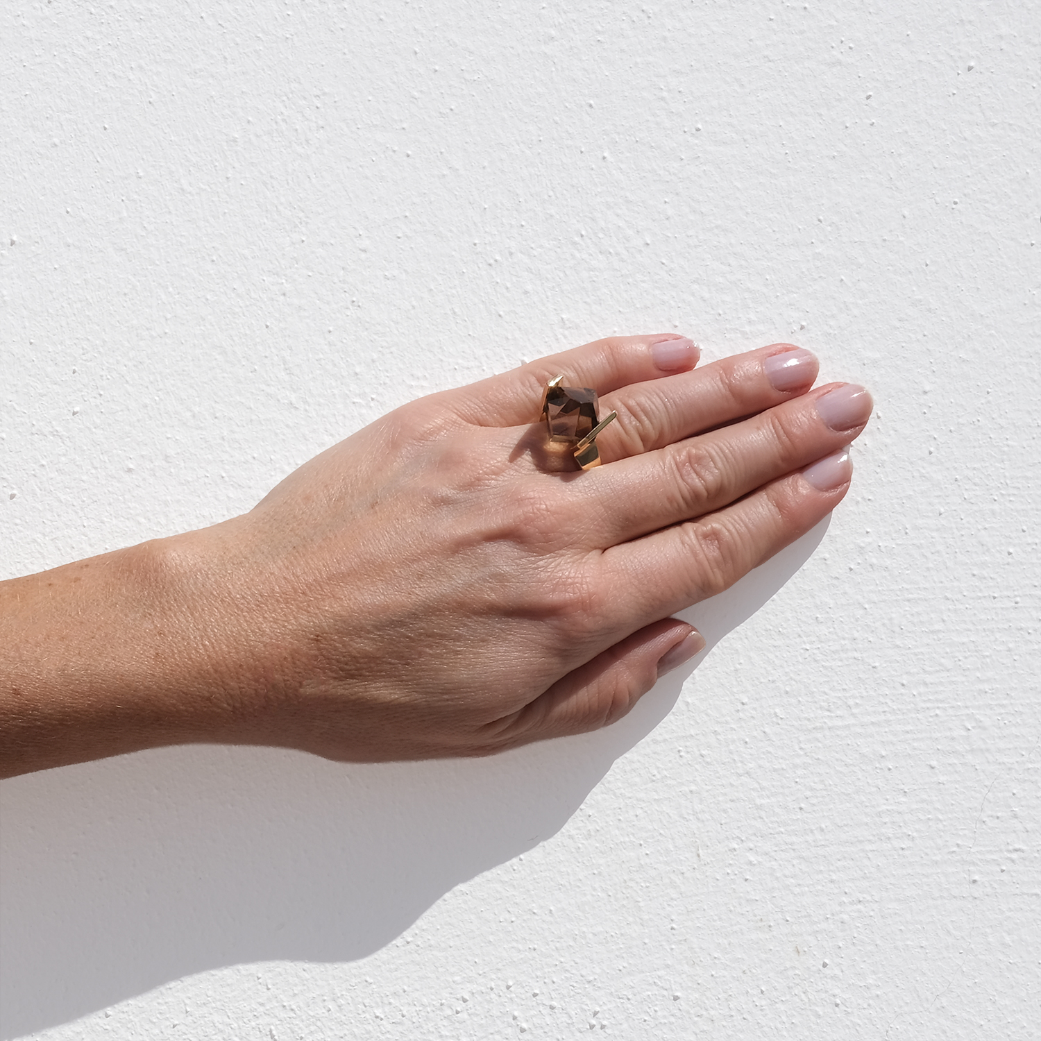 This vintage ring is crafted in 18-karat gold and set with a sculptural smoky quartz. The stone has an angular, multi-faceted form with sharp planes that catch the light, showing a deep translucent brown tone. It is held between two extended gold elements that rise from the shank and frame the quartz in an architectural way. The shank itself curves in a smooth, asymmetric line, creating a continuous movement that leads the eye toward the stone.