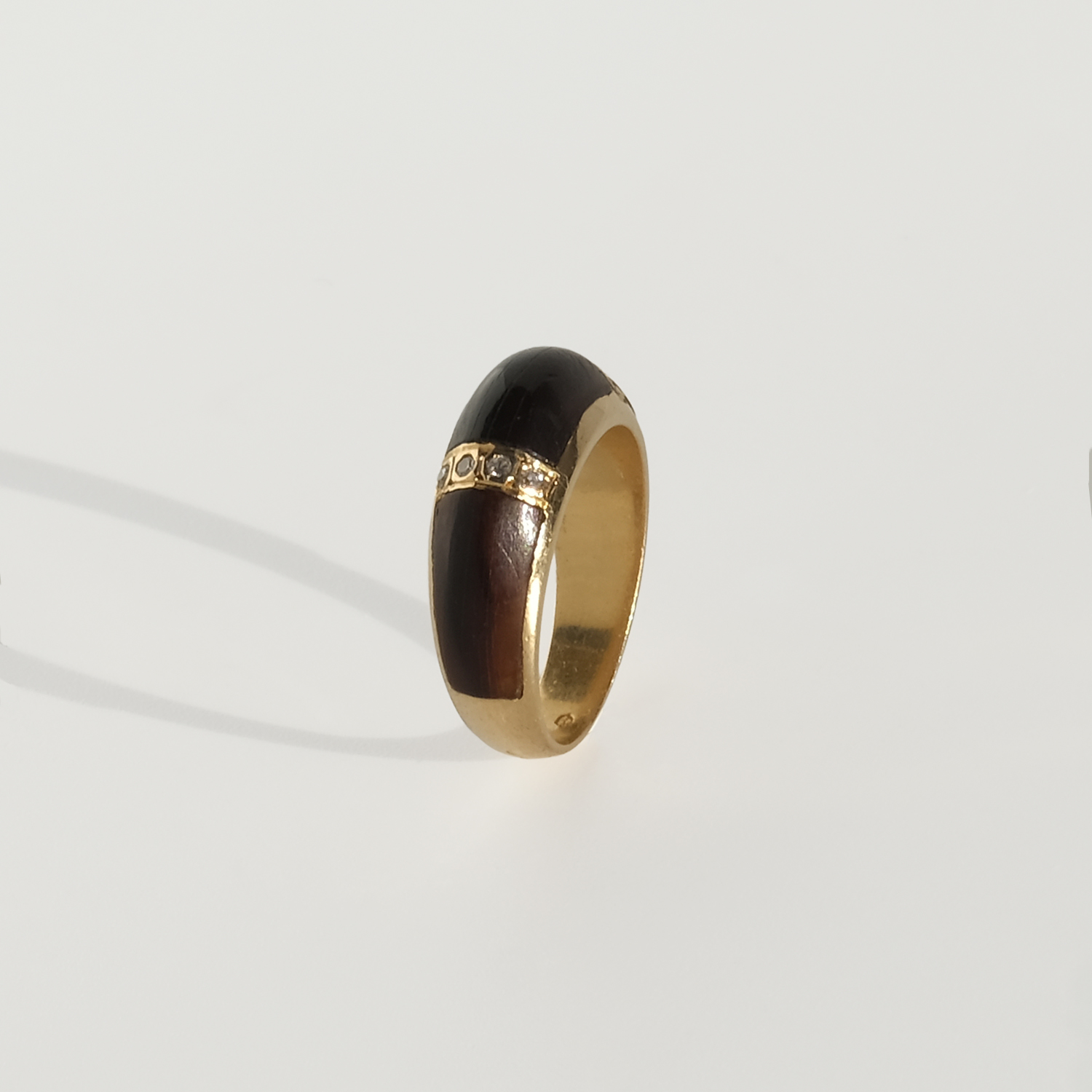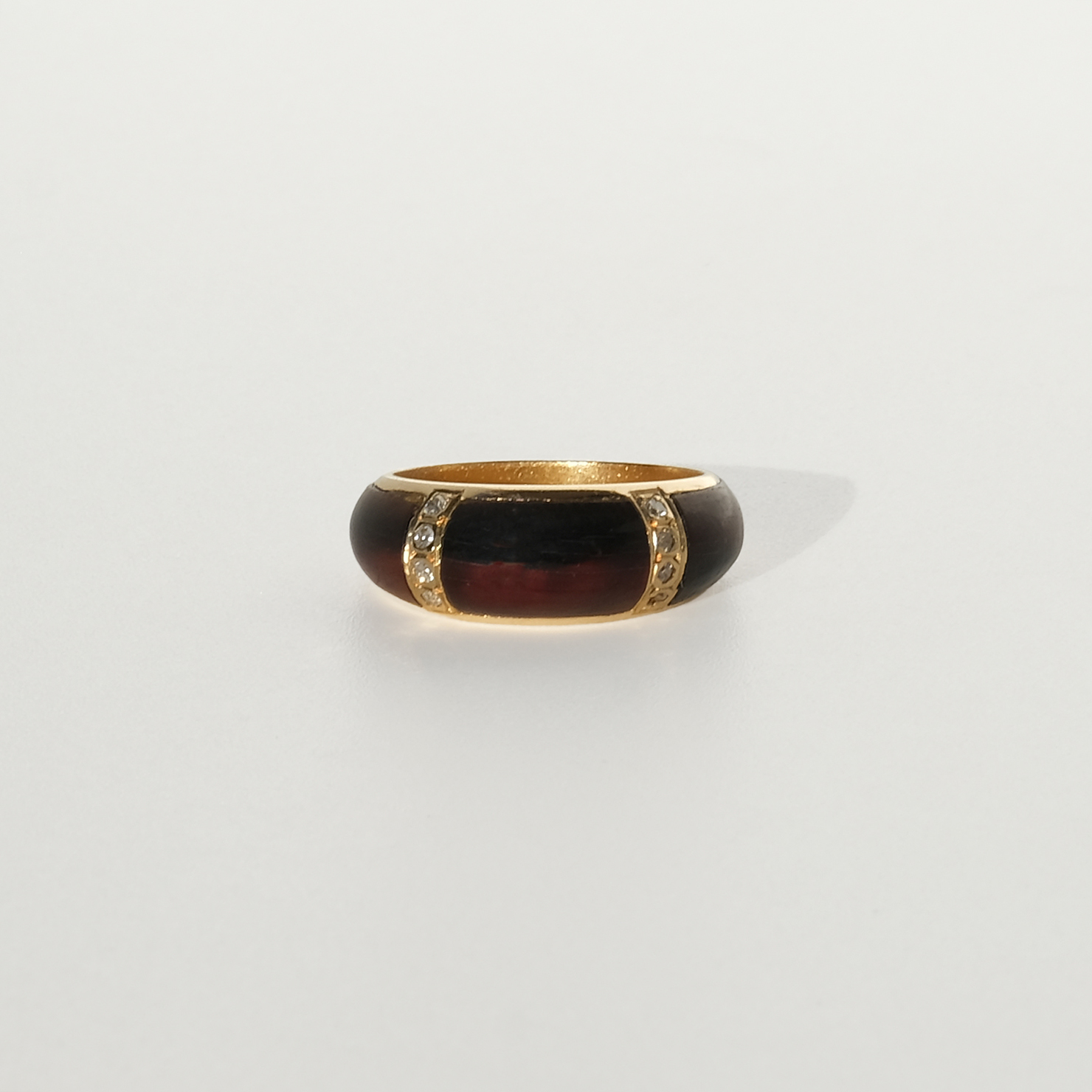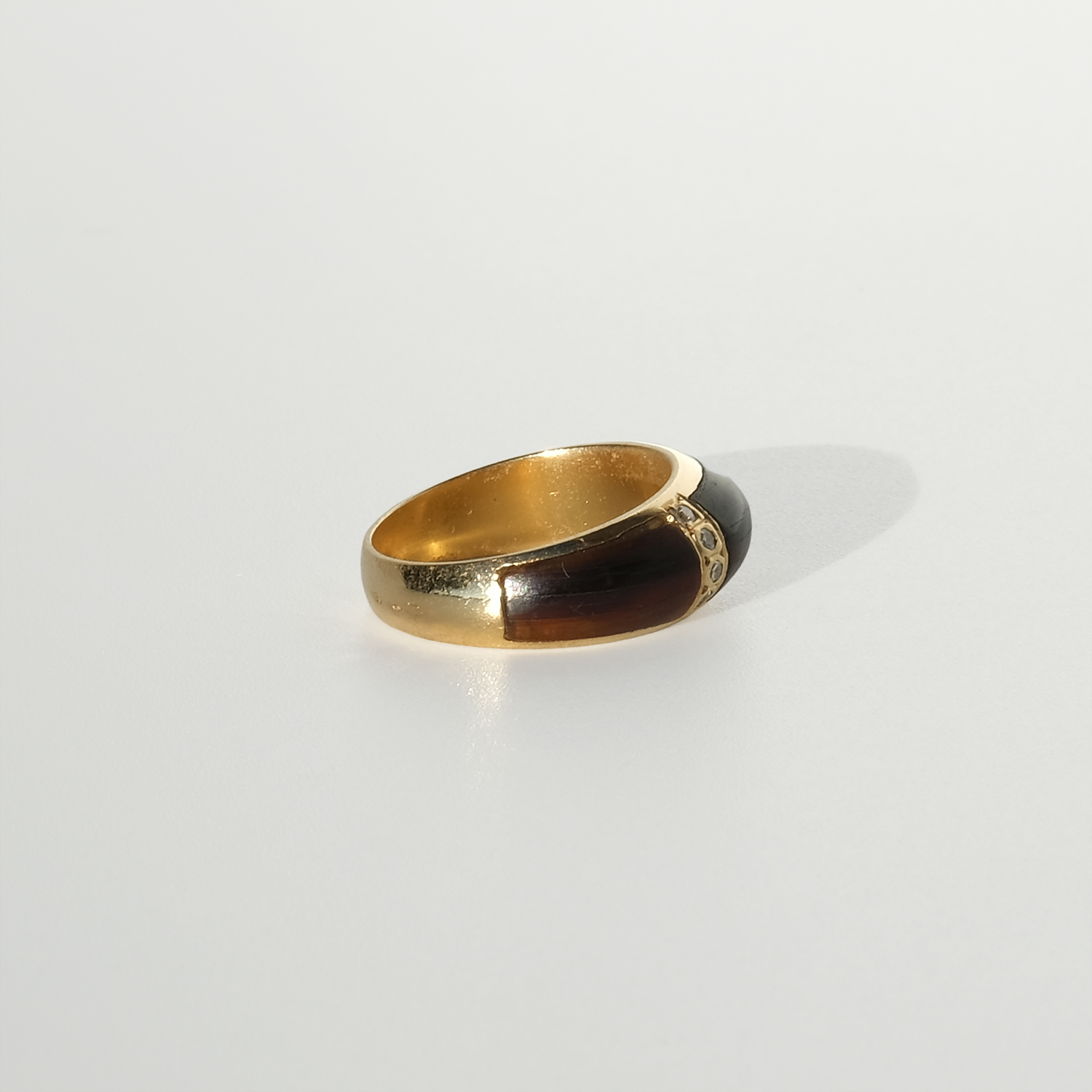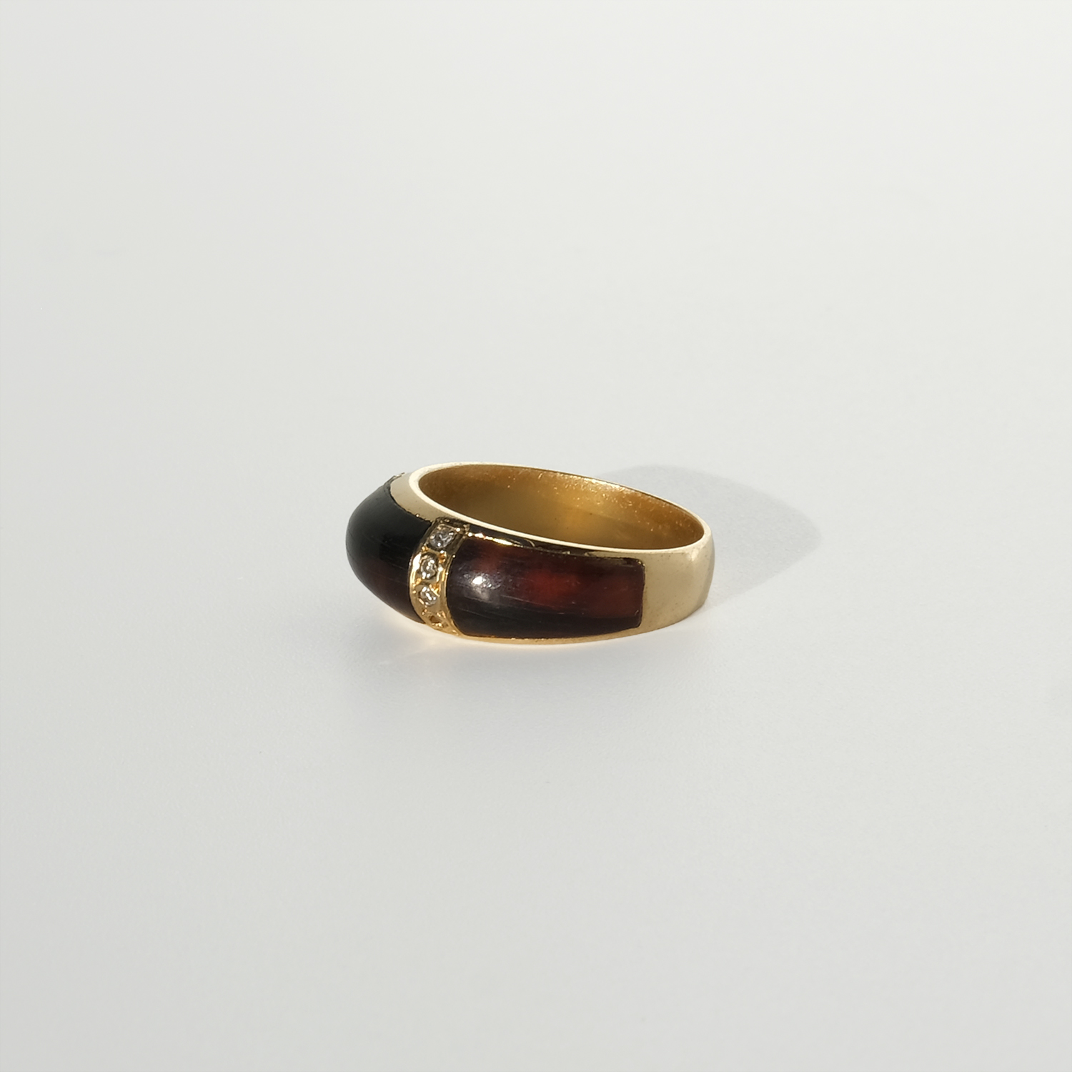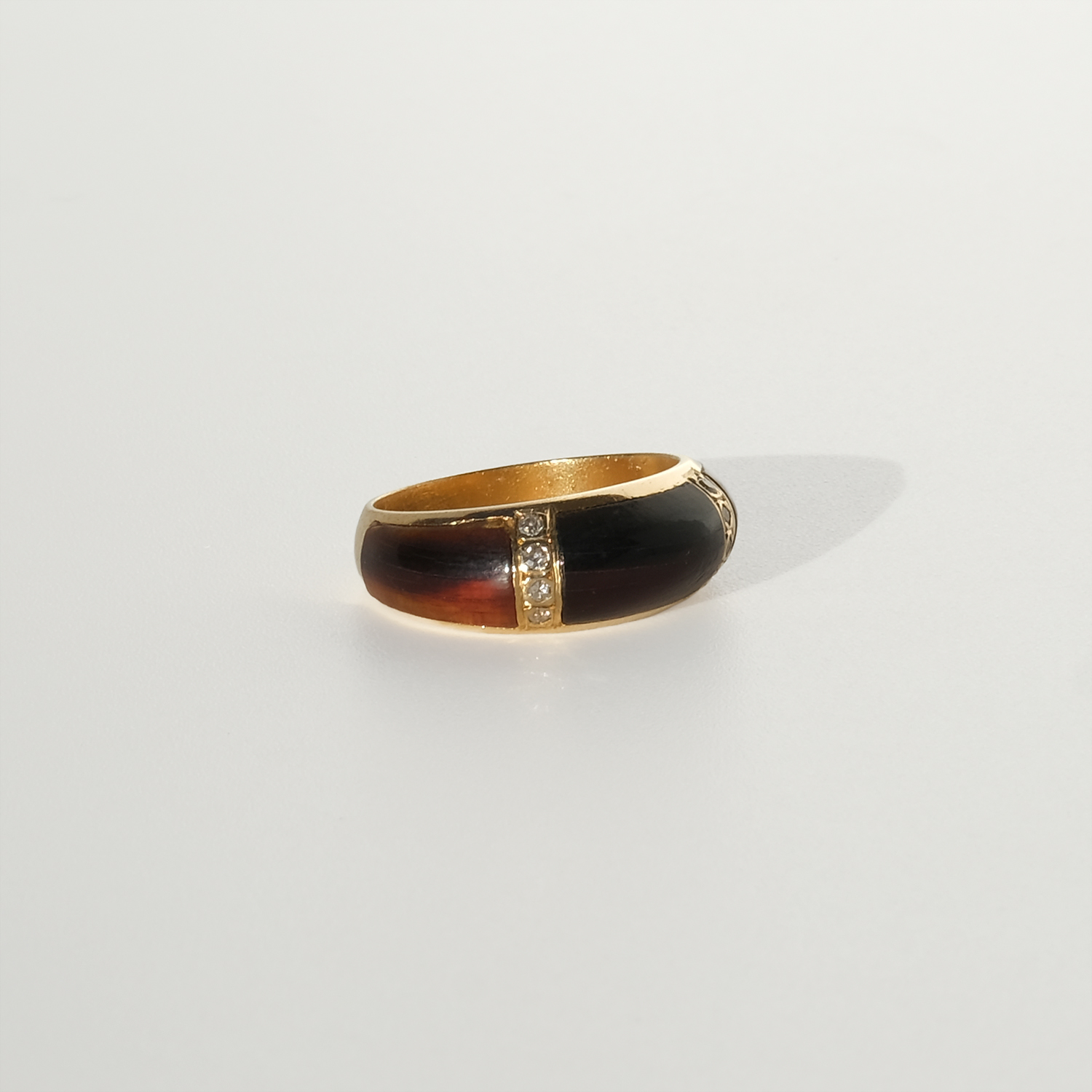 This mid-20th-century ring is crafted in 18k gold with panels of tortoiseshell and small octagonal-cut diamonds. The ring has a softly rounded, slightly domed profile that sits low and comfortably on the finger.