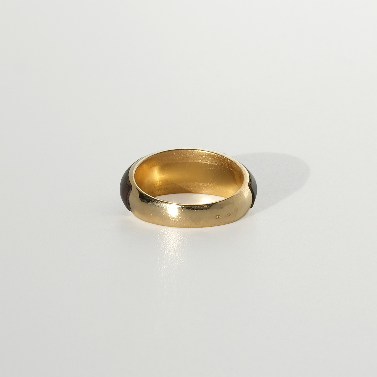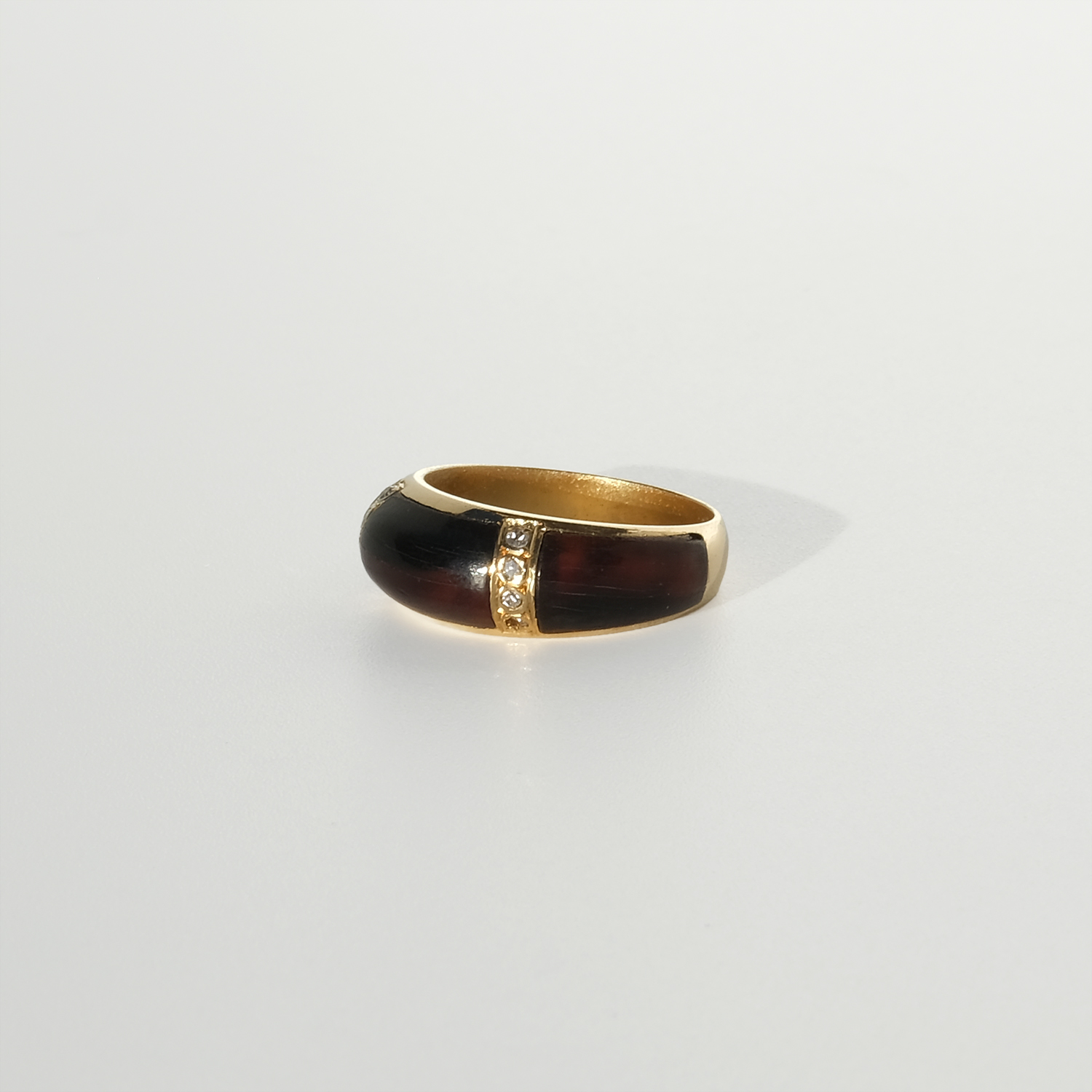 Dark, translucent tortoiseshell is set flush into the gold, its warm brown tones showing subtle natural variation. Two narrow gold bands interrupt the shell, each set with a line of octagonal-cut diamonds that add quiet definition rather than sparkle. The gold is smooth and substantial, framing the materials with clean, confident lines. From the side, the band gently narrows toward the back, softening the overall profile and improving comfort.