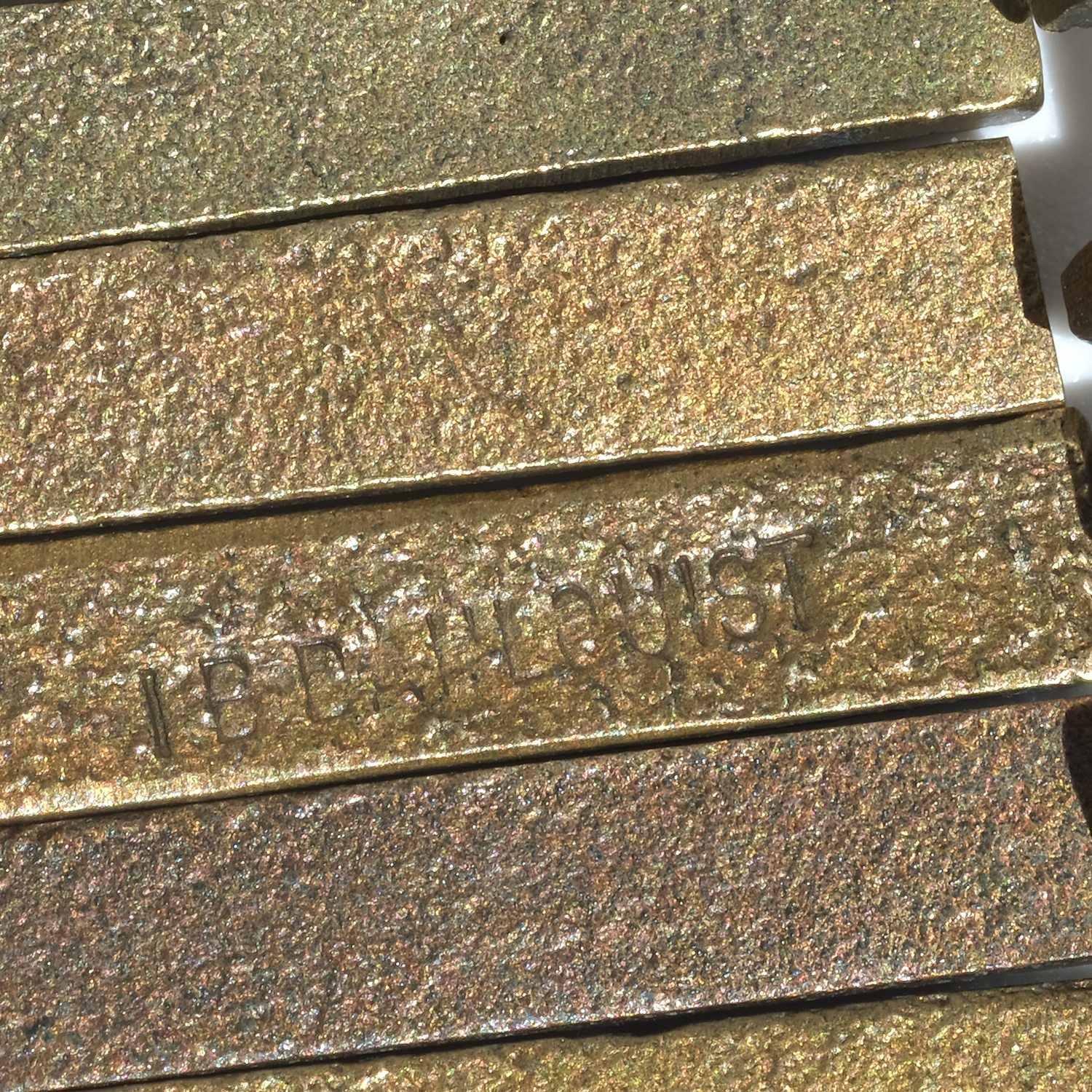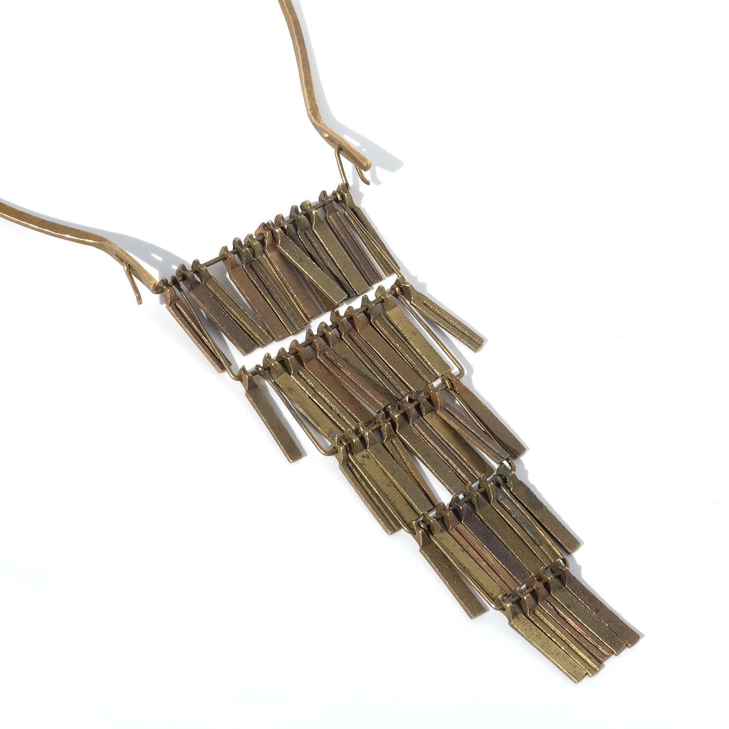 Suspended from the lower edge is a cascading arrangement of rectangular plates. They are set in graduated rows, widest at the top due to the greater number of plates, and narrowing step by step toward the bottom, creating a tapered, almost triangular silhouette. The plates are primarily brass, with some in a slightly warmer, reddish tone consistent with bronze. Each plate hangs freely, catching the light with a muted, warm tone and subtle variation in colour.