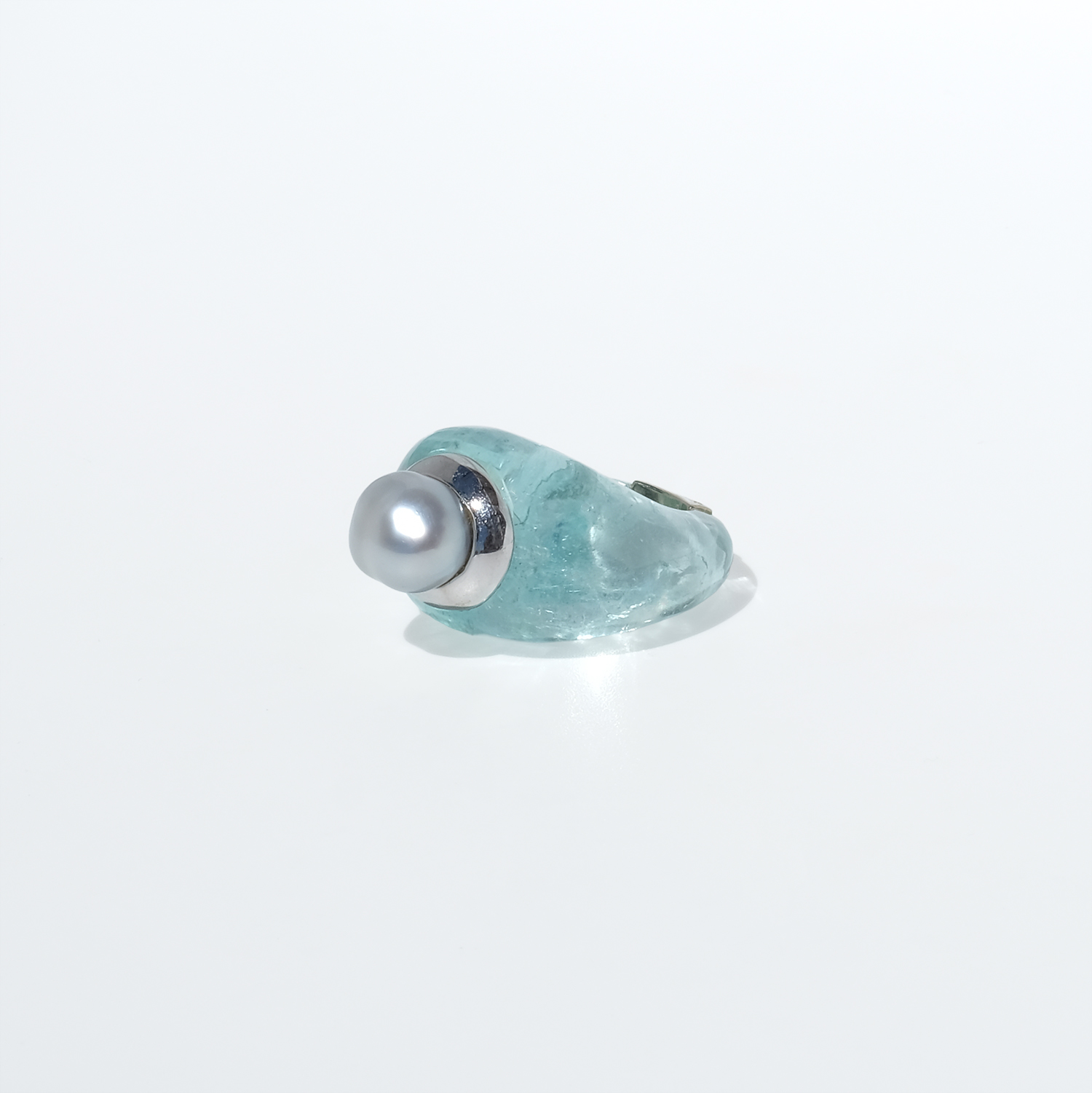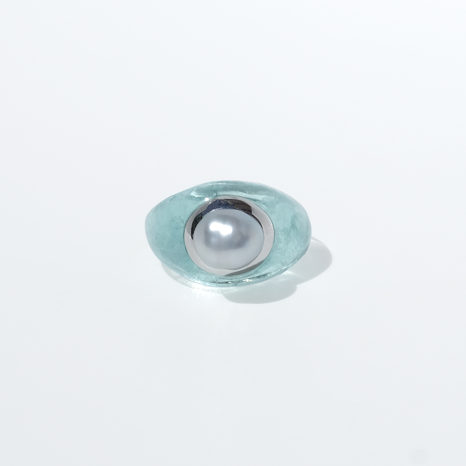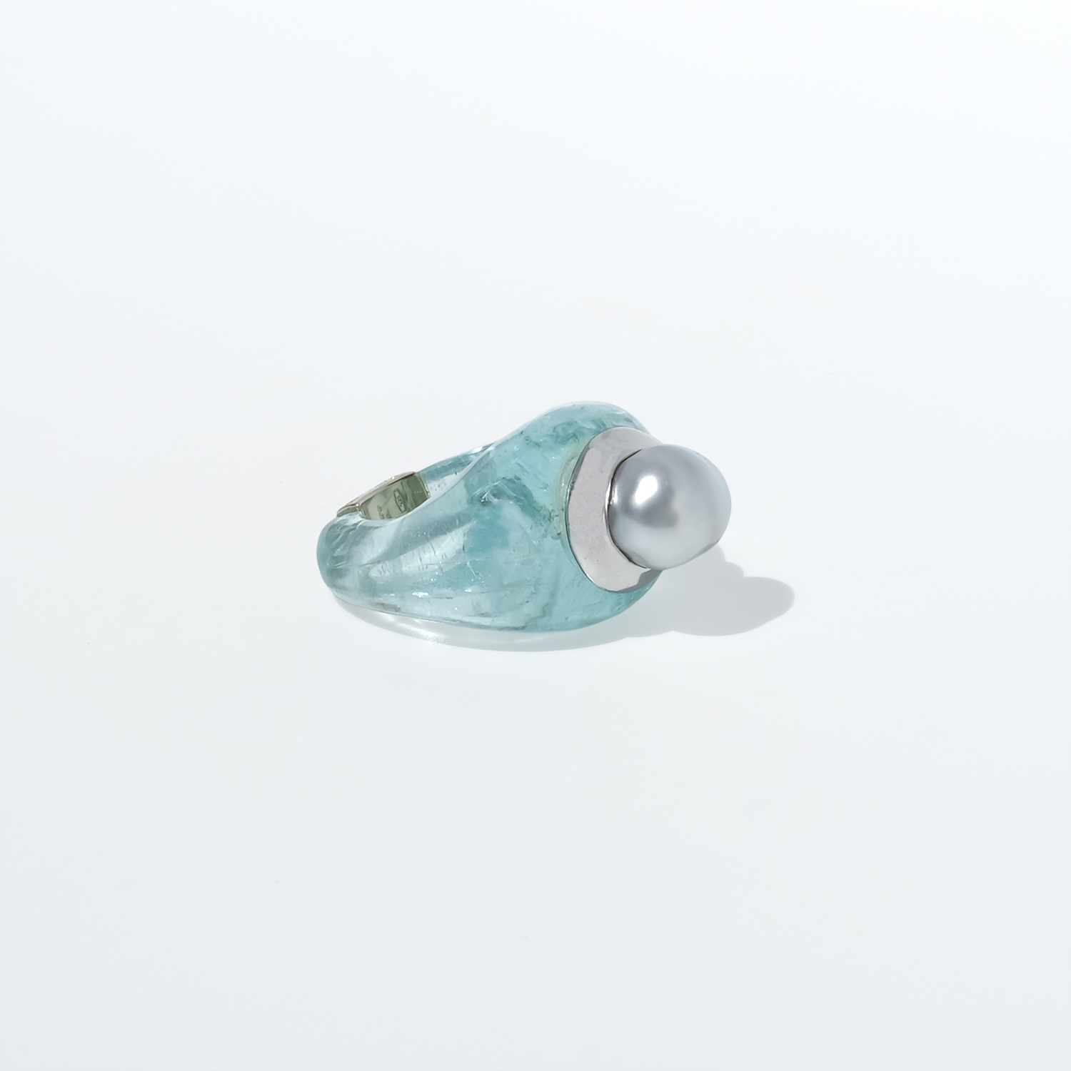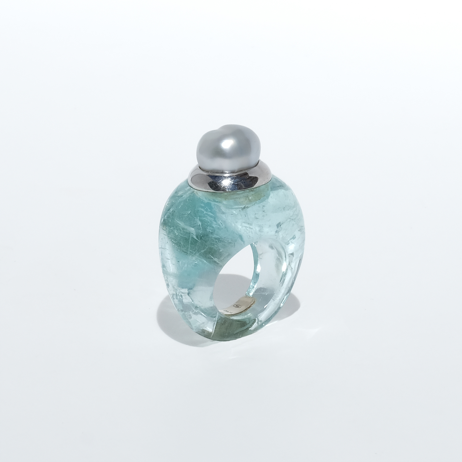 This vintage ring is carved from aquamarine, forming the entire body in one smooth, sculptural shape. The stone has a clear pale aqua tone with soft internal veils and natural variations that give it depth and life. At the top sits a white-gold setting crowned by a cultured pearl in a silvery white shade, slightly irregular in shape and all the more beautiful for it.