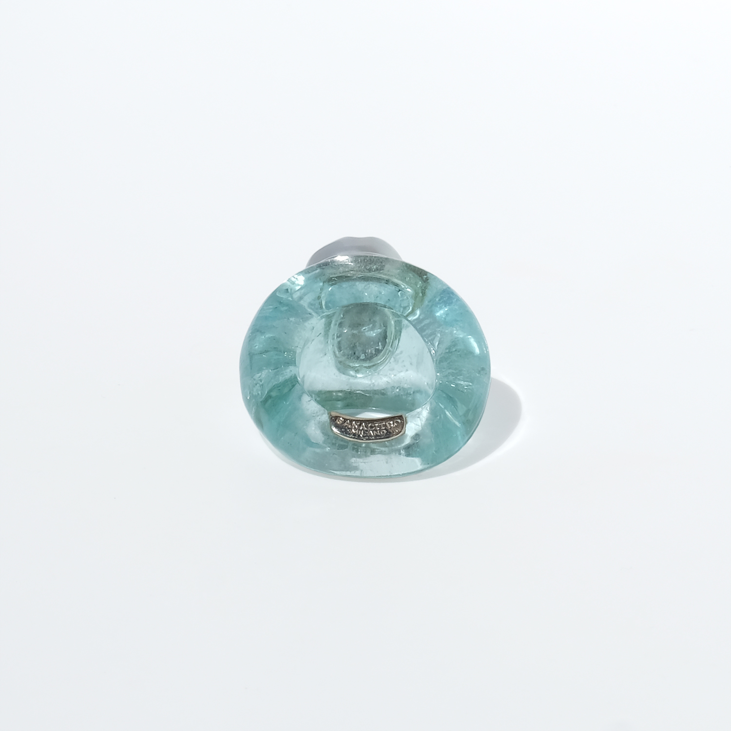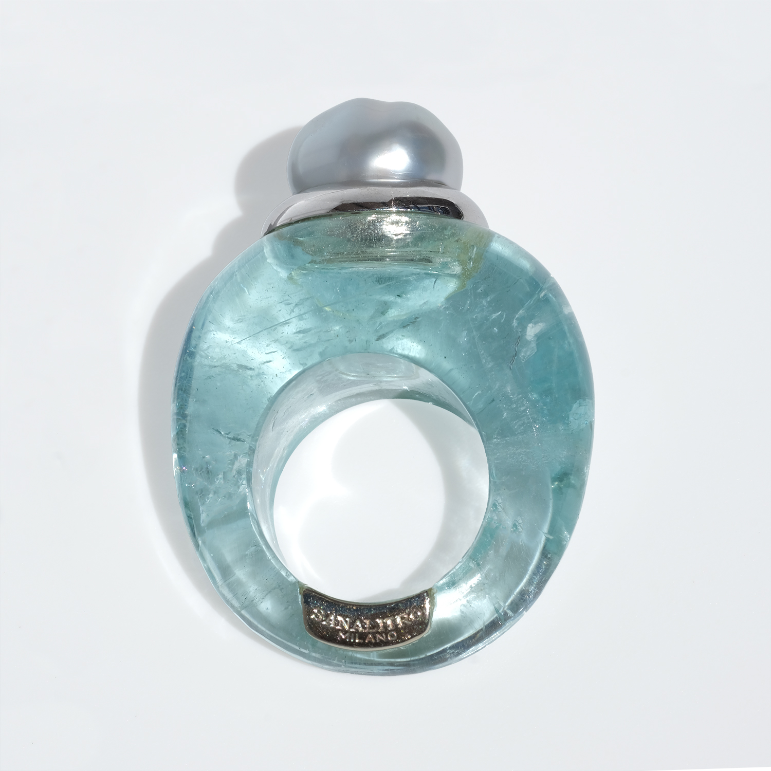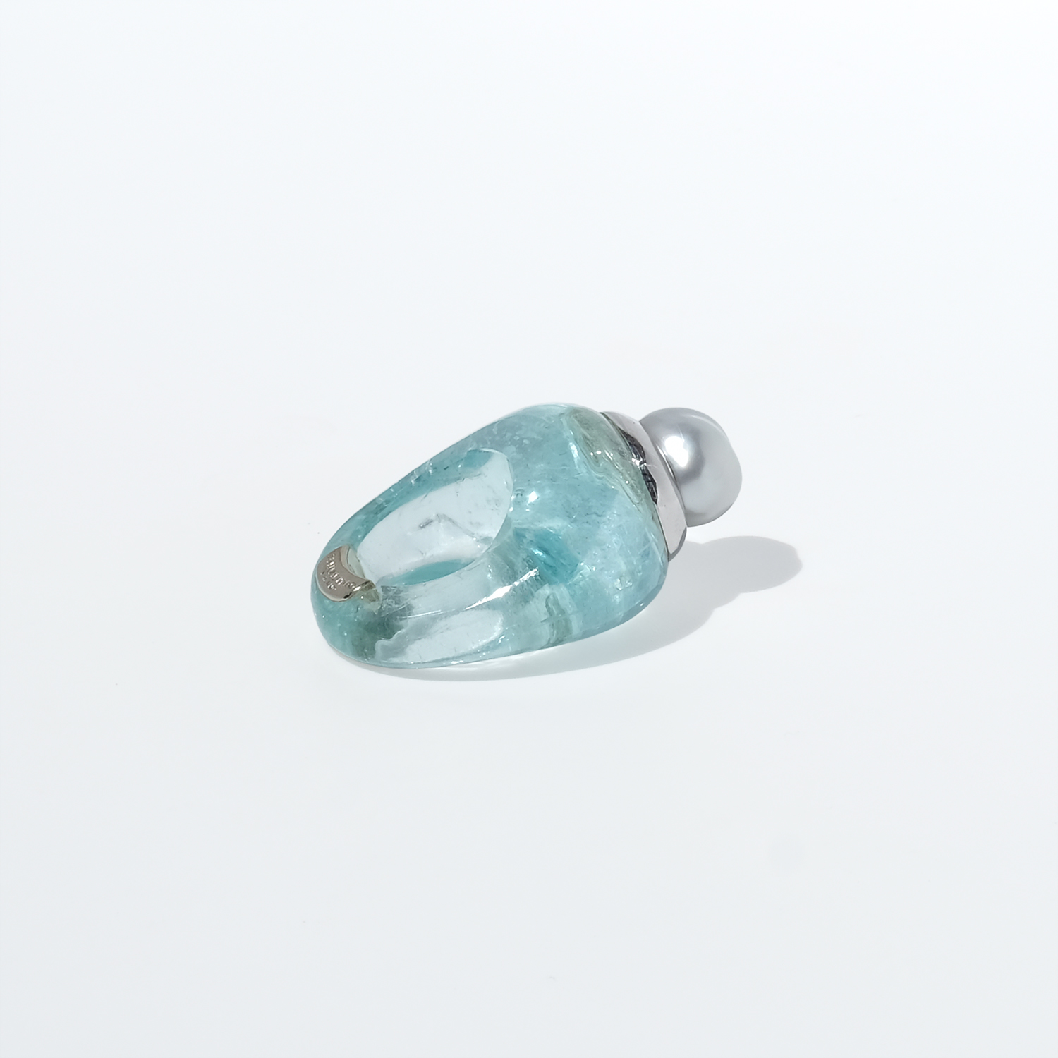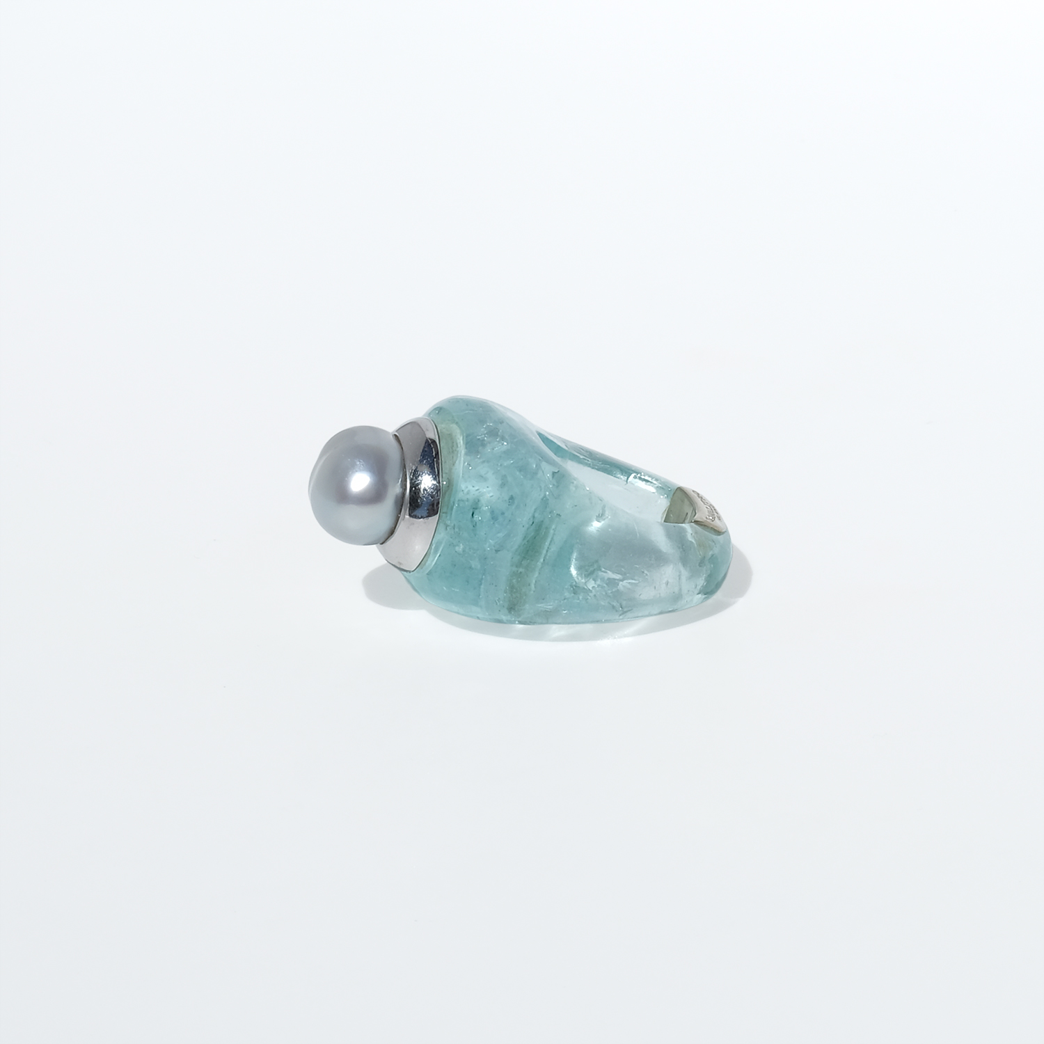 This vintage ring is carved from aquamarine, forming the entire body in one smooth, sculptural shape. The stone has a clear pale aqua tone with soft internal veils and natural variations that give it depth and life. At the top sits a white-gold setting crowned by a cultured pearl in a silvery white shade, slightly irregular in shape and all the more beautiful for it.