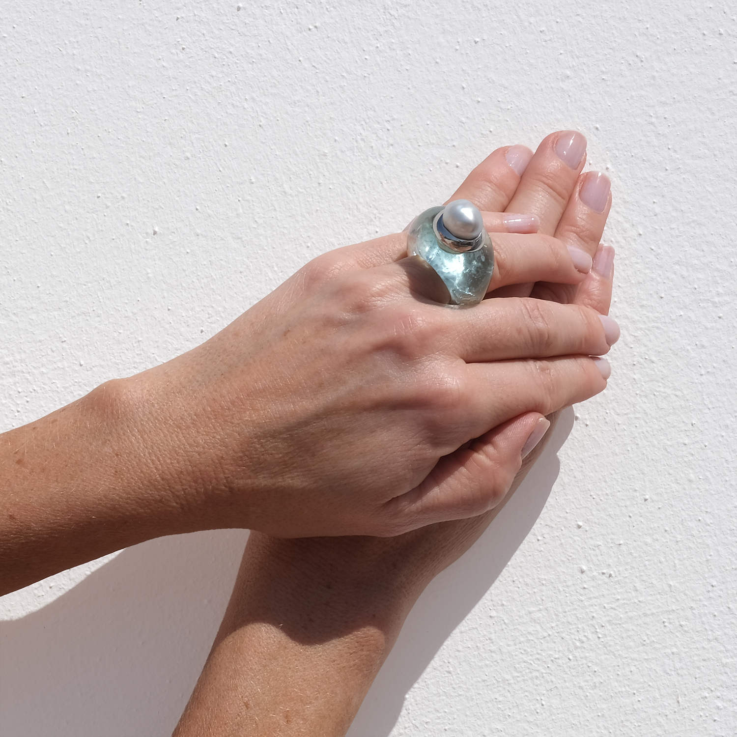 Worn, it feels bold yet calm, almost like a small object from the sea. The slight irregularities in both stone and pearl are what make it so right—less polished perfection, more character.