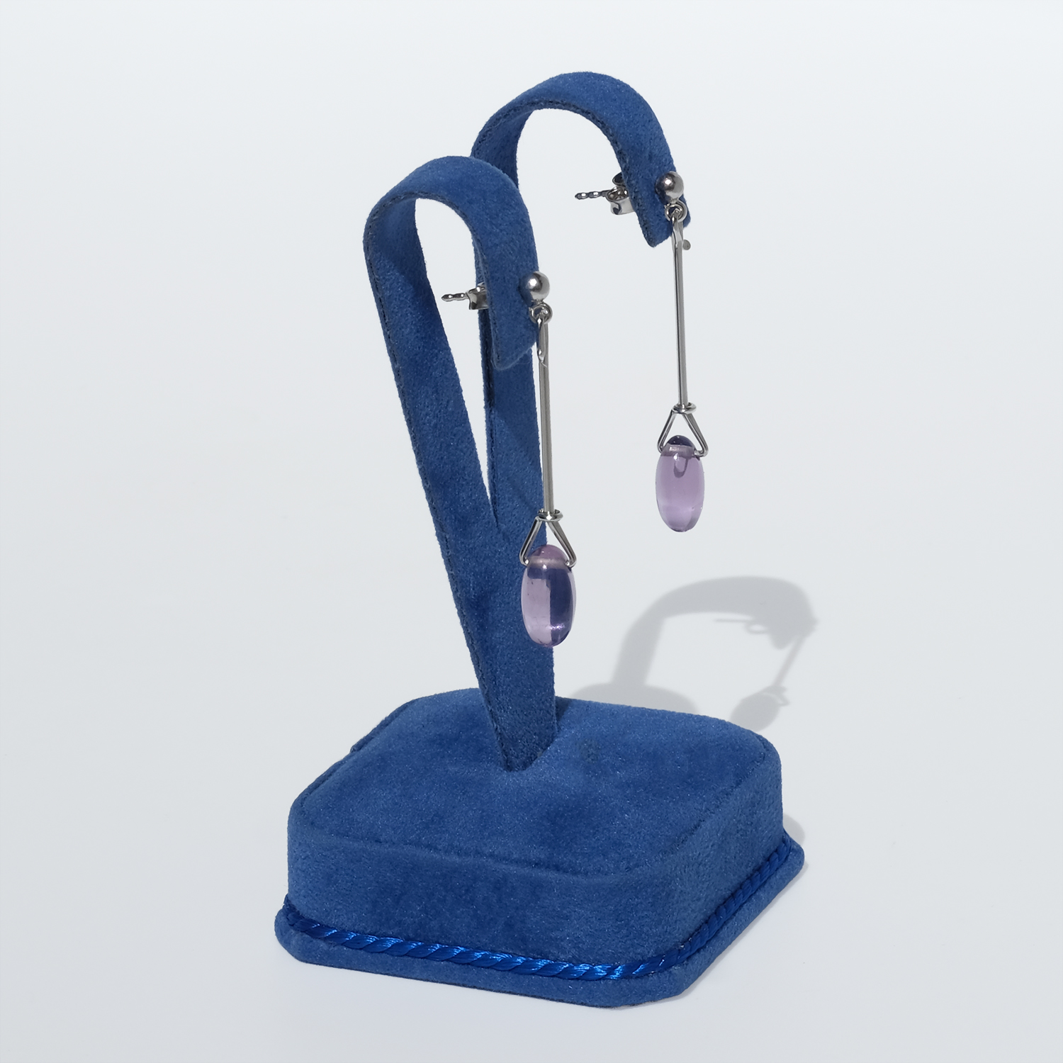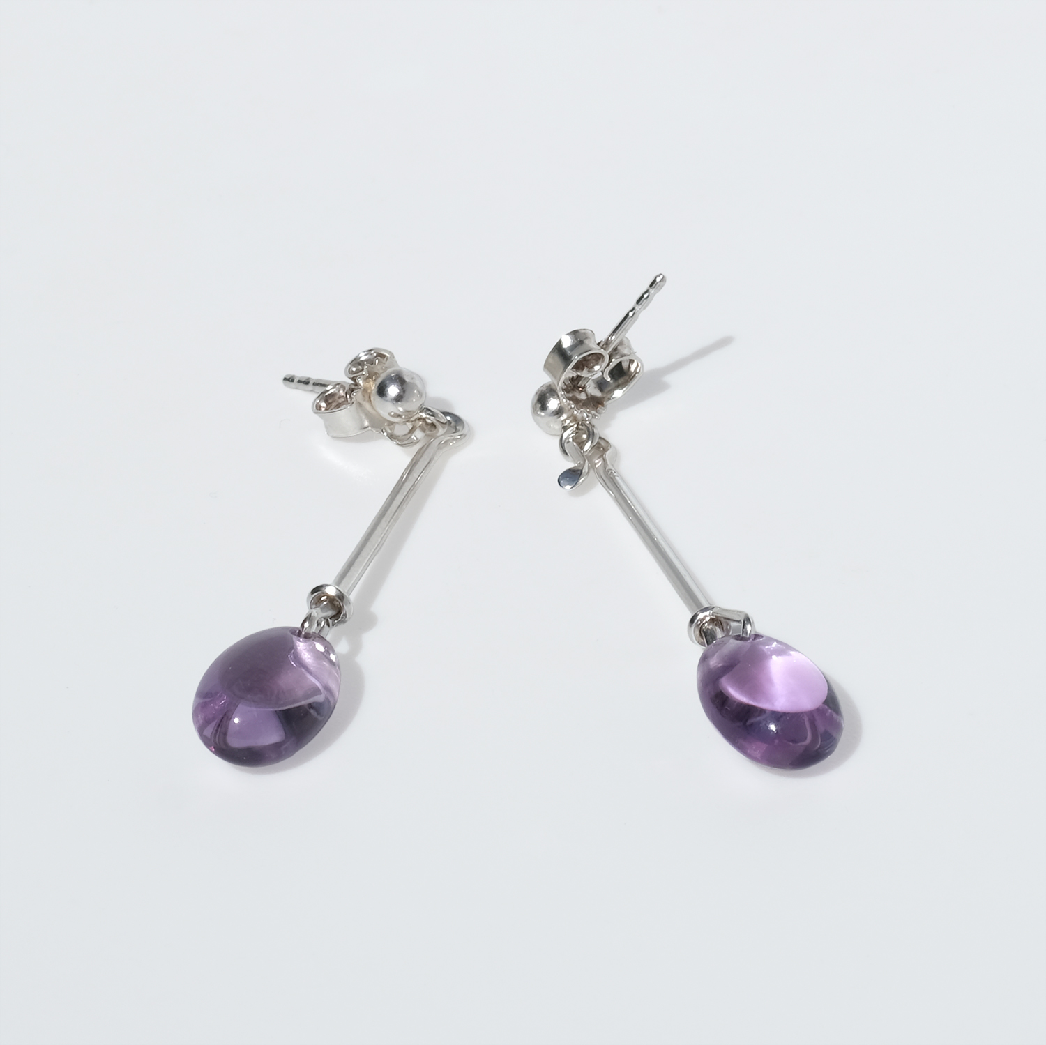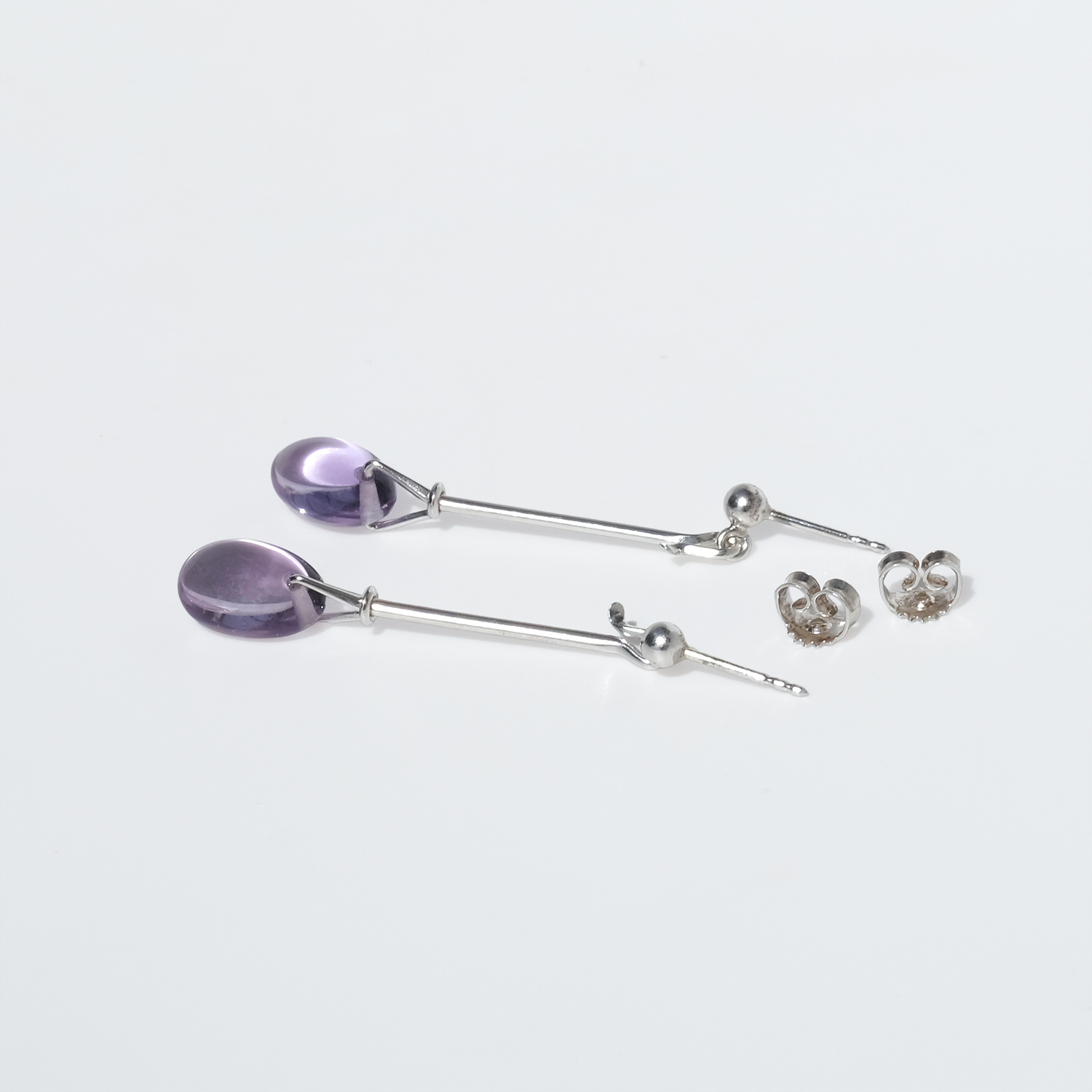 Vintage earrings in silver and amethyst with a light, slender silhouette. Each earring begins with a small silver stud in a polished ball form, followed by a gently curved detail that leads into a long, fine silver drop. Near the lower part of the stem, a small rectangular detail adds balance before the earring ends in an oval amethyst drop. The stones are smooth and softly rounded, with a clear lilac-purple tone that catches the light beautifully. Their transparent, liquid-like look contrasts nicely with the clean silver lines. Part of the “Dew Drop” collection, the design has the same quiet, fluid elegance suggested by the name.