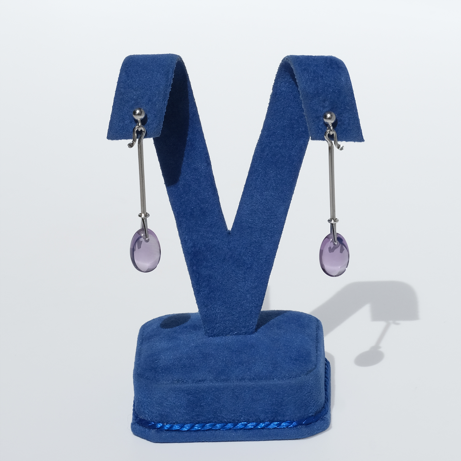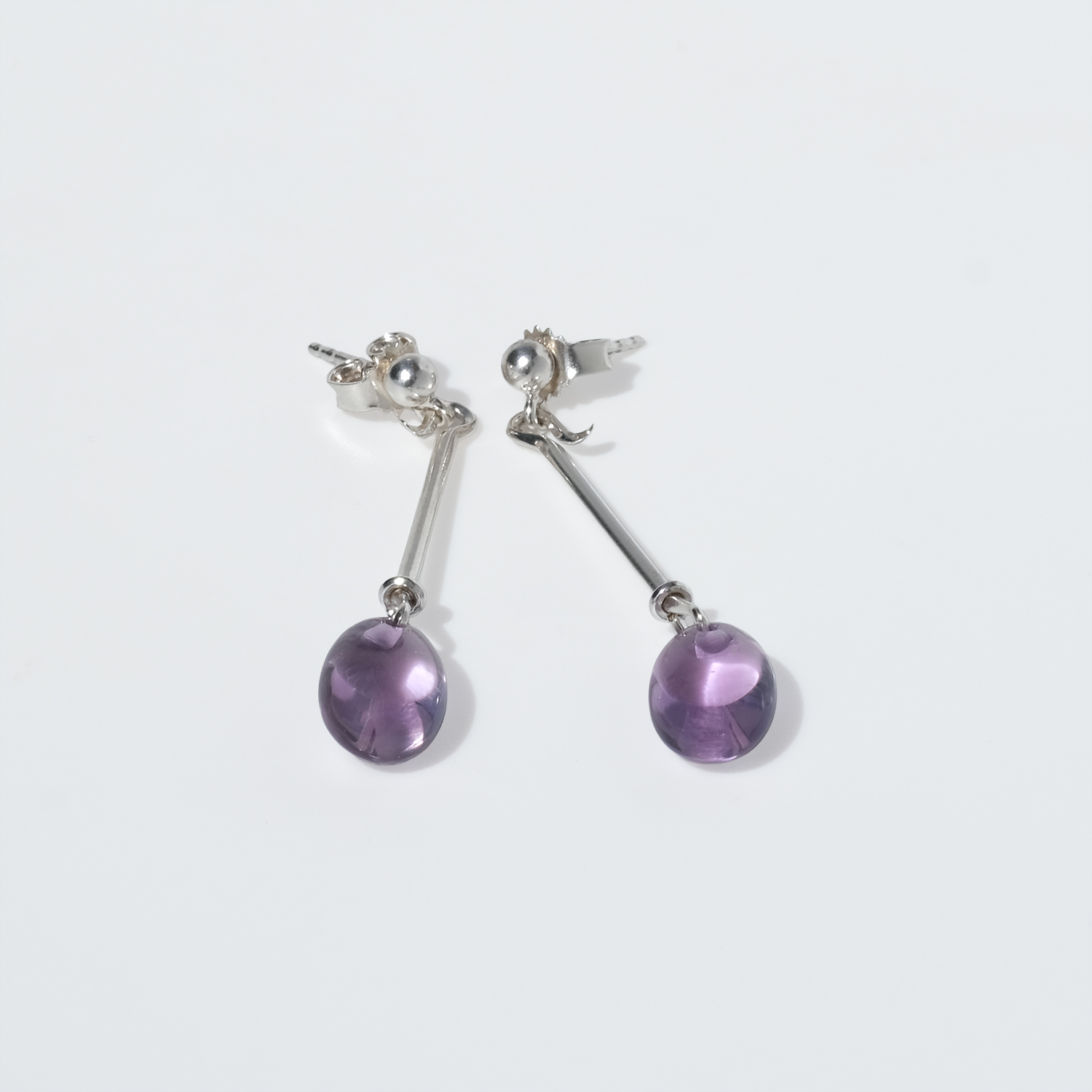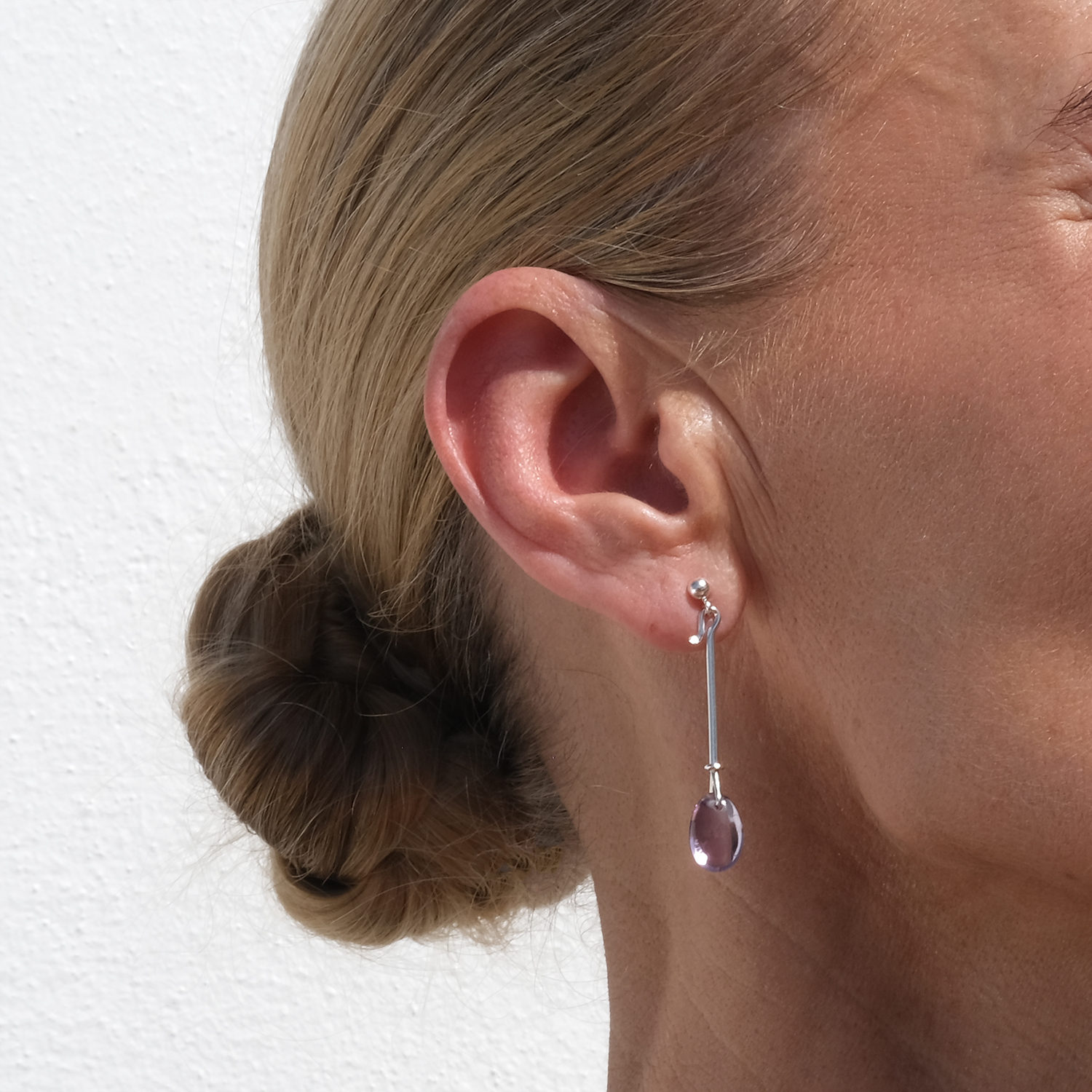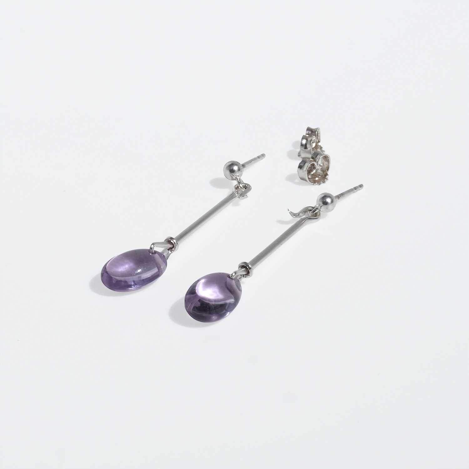 Vintage earrings in silver and amethyst with a light, slender silhouette. Each earring begins with a small silver stud in a polished ball form, followed by a gently curved detail that leads into a long, fine silver drop. Near the lower part of the stem, a small rectangular detail adds balance before the earring ends in an oval amethyst drop. The stones are smooth and softly rounded, with a clear lilac-purple tone that catches the light beautifully. Their transparent, liquid-like look contrasts nicely with the clean silver lines. Part of the “Dew Drop” collection, the design has the same quiet, fluid elegance suggested by the name.