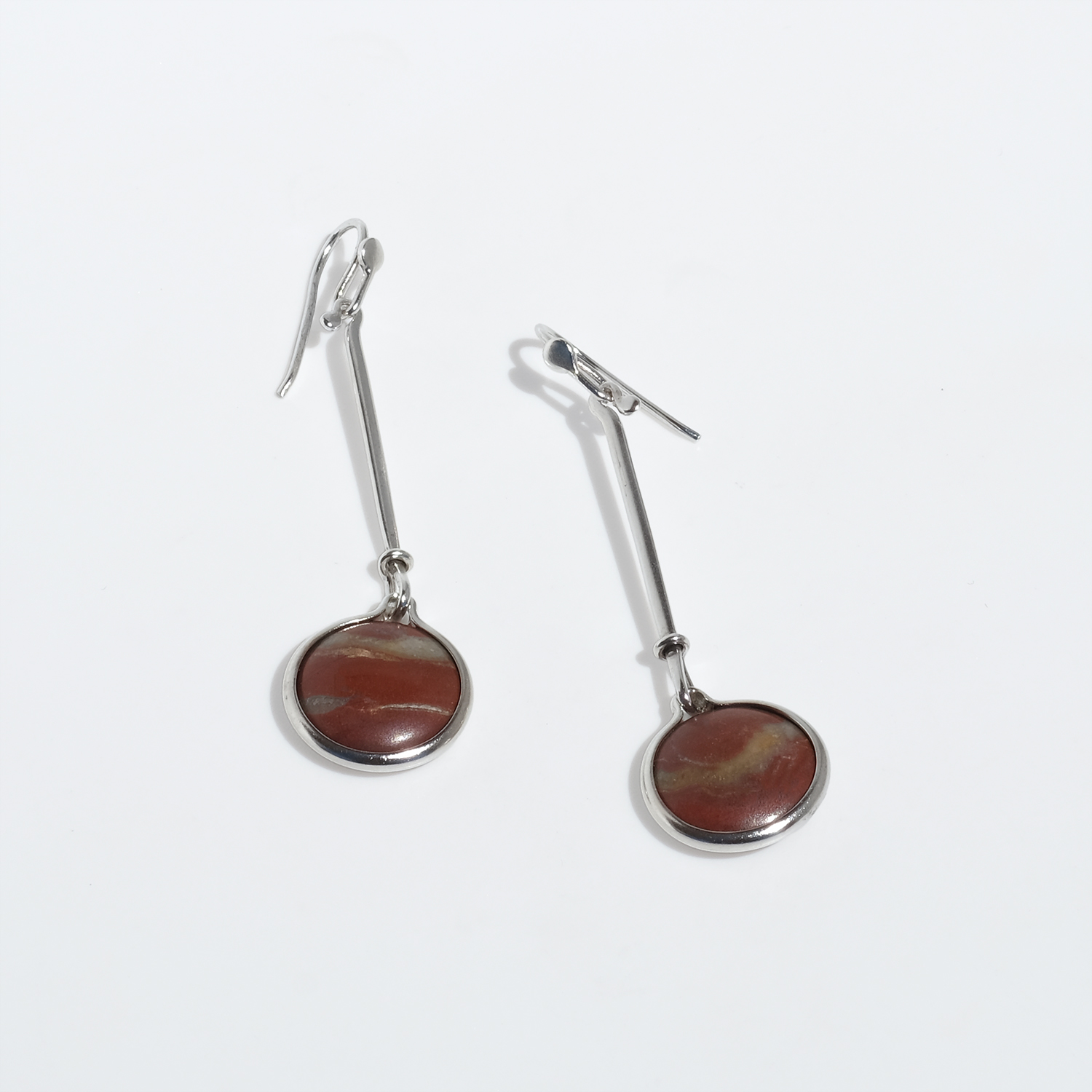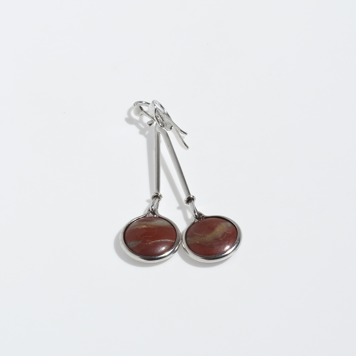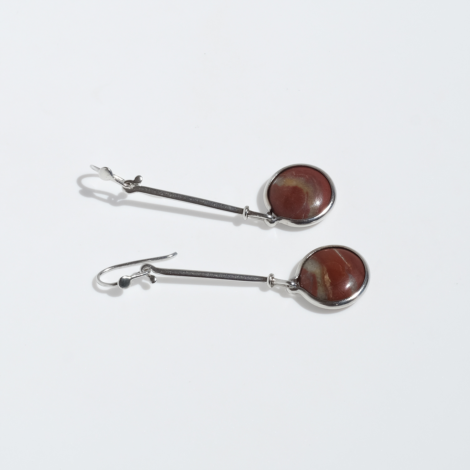 The jasper is circular and gently domed, with warm earthy tones of brick red, rust, sandy beige and muted cream flowing across the surface in natural bands. On the ear, they hang light and long, drawing the eye downward without feeling sharp. Calm, graphic, and a little poetic — the kind of earrings that do the talking in a quiet voice.