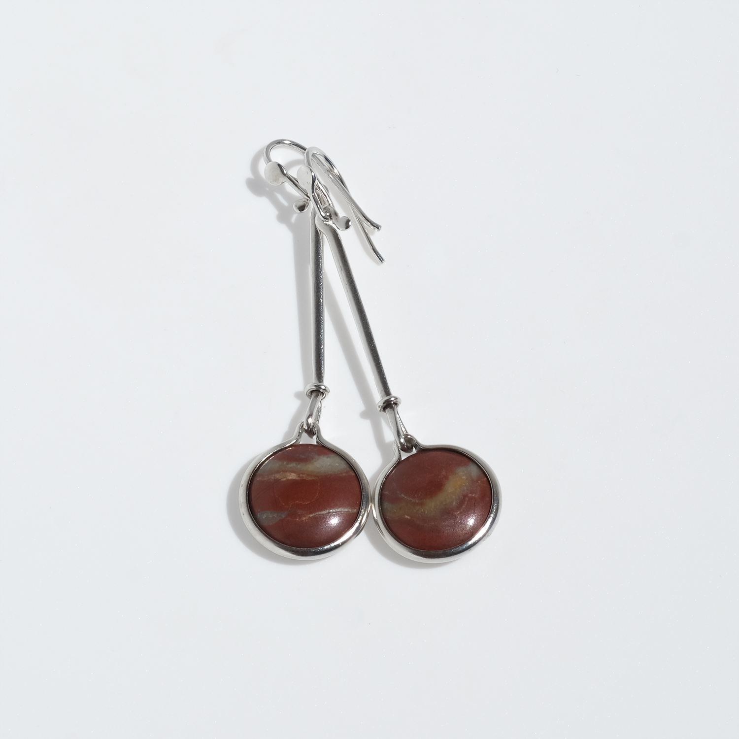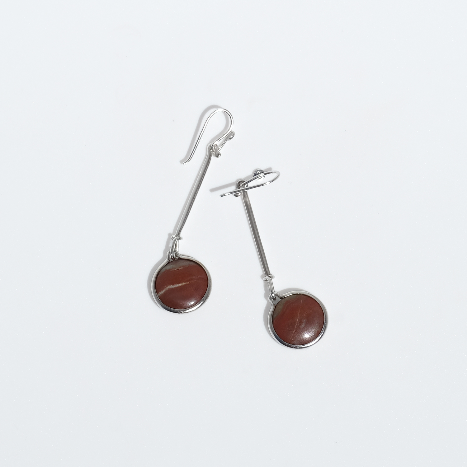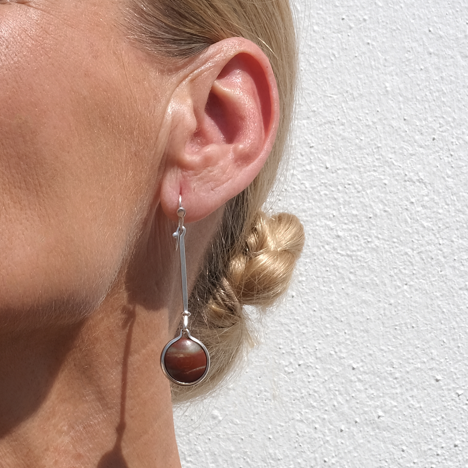 The jasper is circular and gently domed, with warm earthy tones of brick red, rust, sandy beige and muted cream flowing across the surface in natural bands. On the ear, they hang light and long, drawing the eye downward without feeling sharp. Calm, graphic, and a little poetic — the kind of earrings that do the talking in a quiet voice.