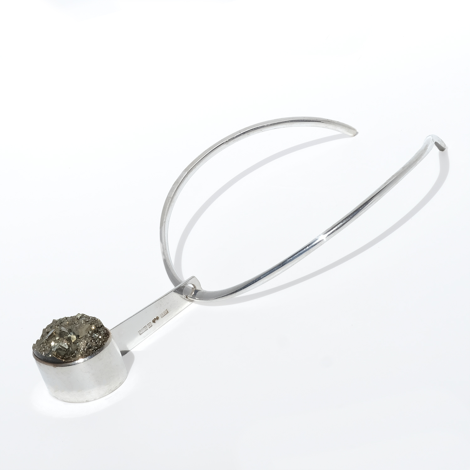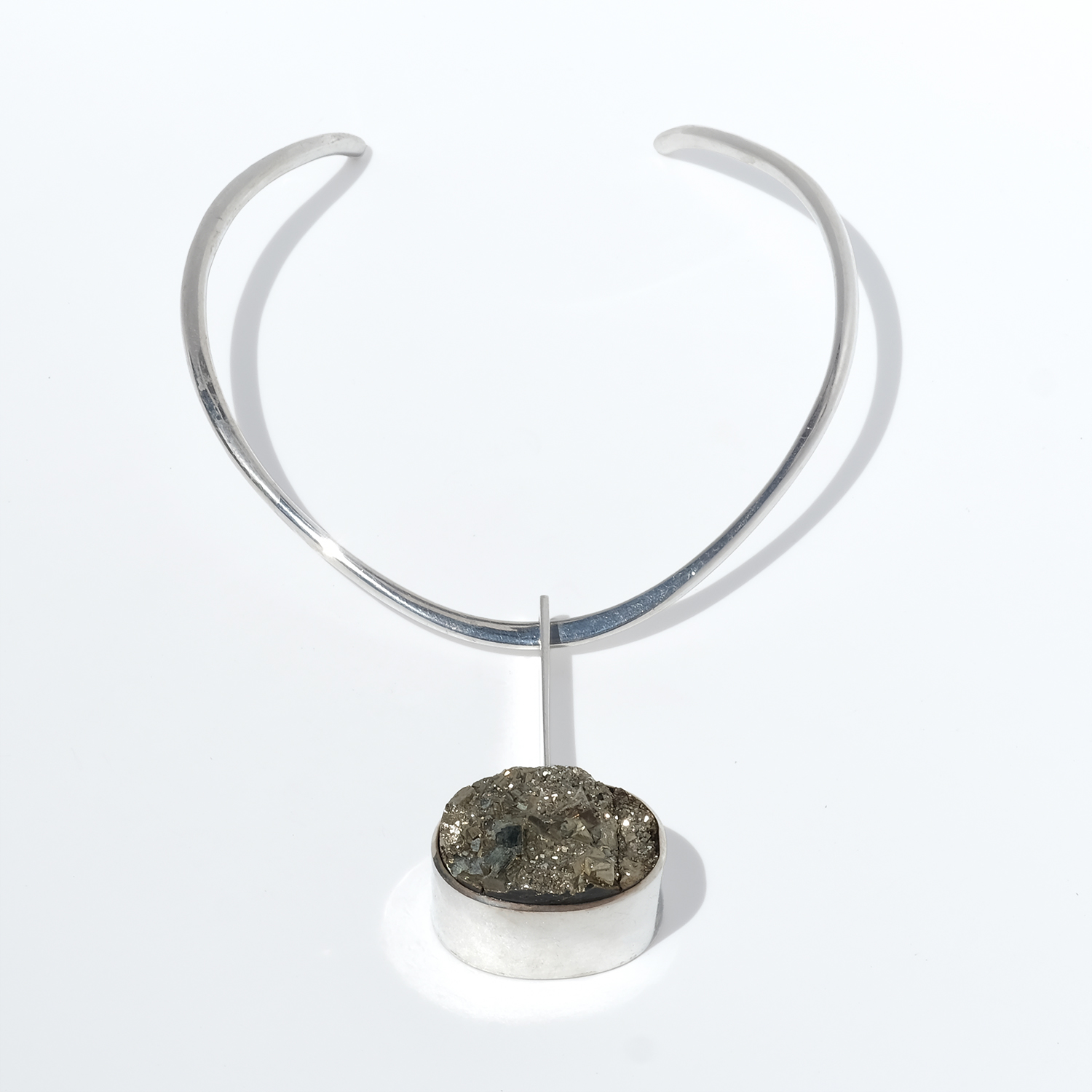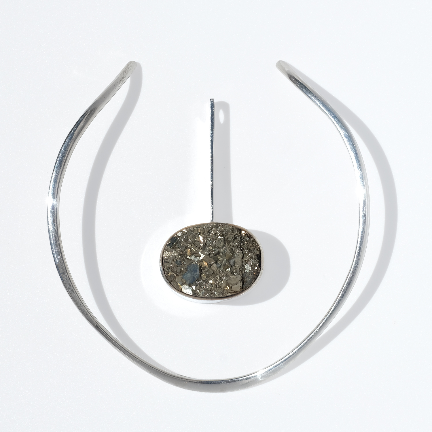 A striking vintage neckring in silver with a detachable silver and pyrite pendant. The neckring has a clean, sculptural line, curving closely around the neck with an open back and softly raised shoulders that sit neatly behind the neck. Toward the front, the silver becomes flatter, giving the piece a sharper, more defined look.
