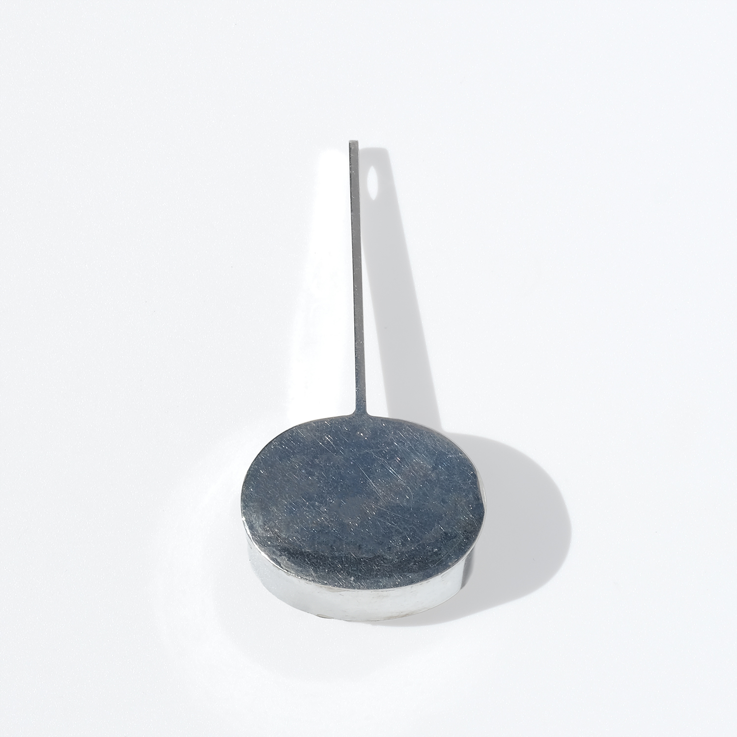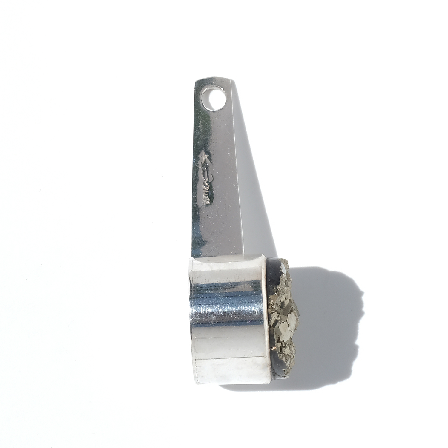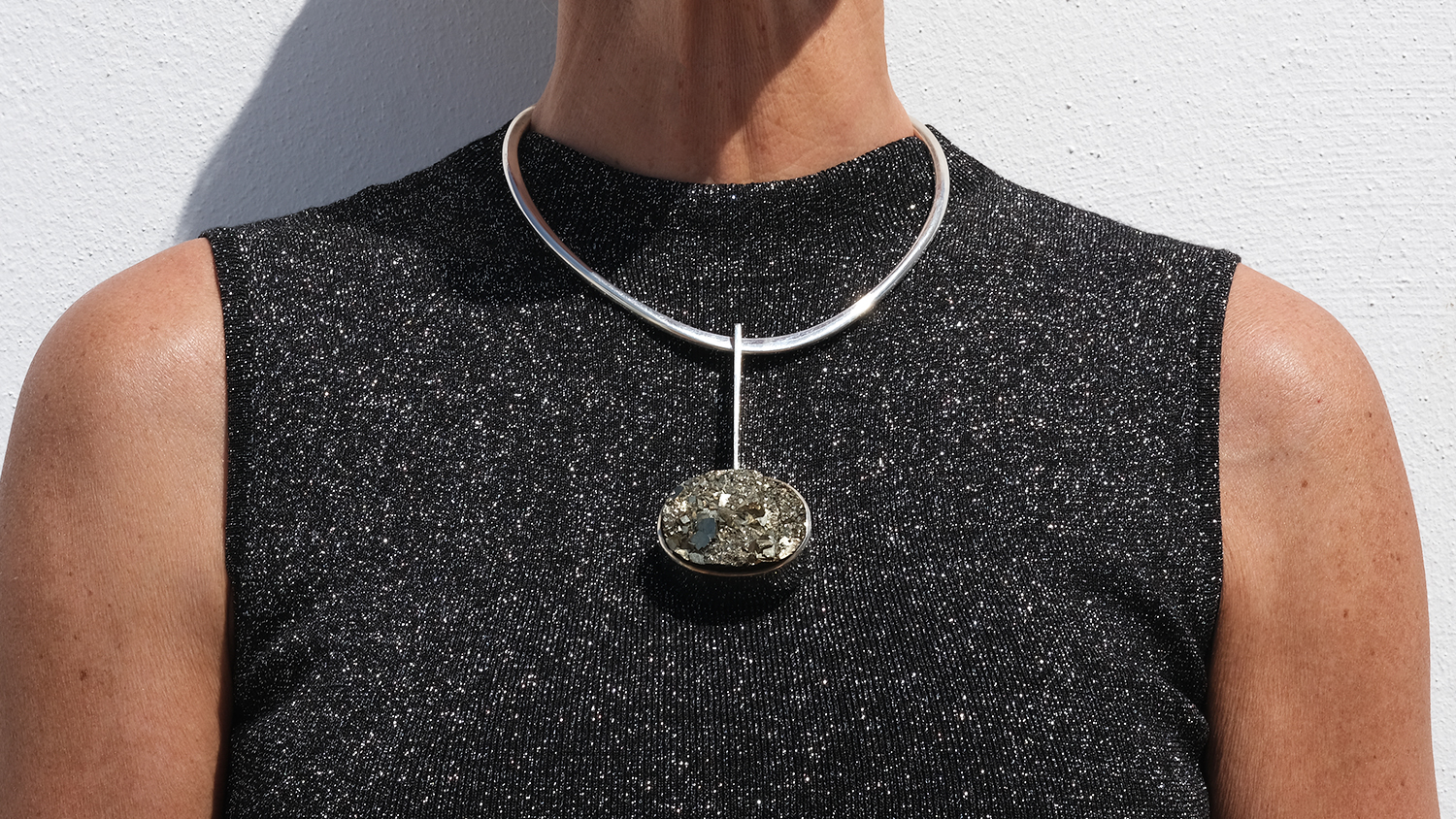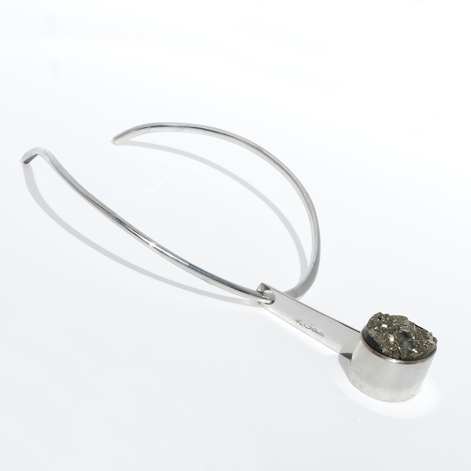 A striking vintage neckring in silver with a detachable silver and pyrite pendant. The neckring has a clean, sculptural line, curving closely around the neck with an open back and softly raised shoulders that sit neatly behind the neck. Toward the front, the silver becomes flatter, giving the piece a sharper, more defined look.