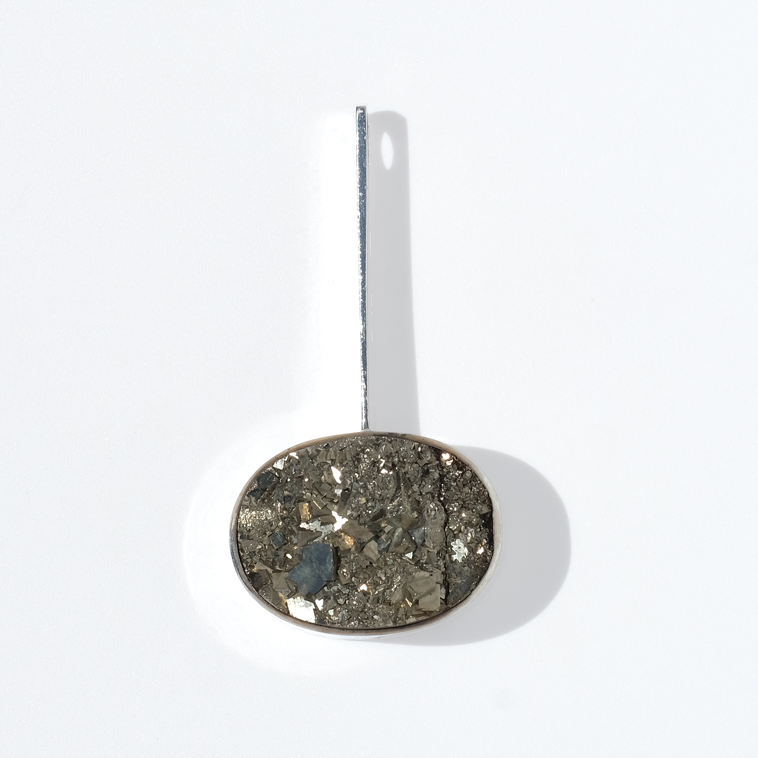 Suspended at the centre is a substantial oval pendant, set in a deep silver mount and held by a long, straight bar. The pyrite has a rough, natural surface with bright metallic lustre and a mix of granular sparkle and larger crystal forms.