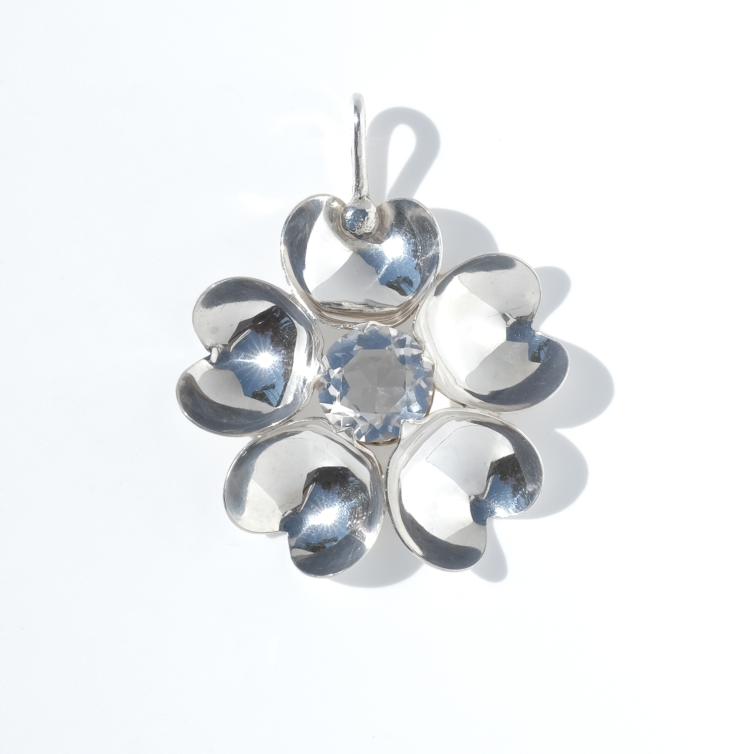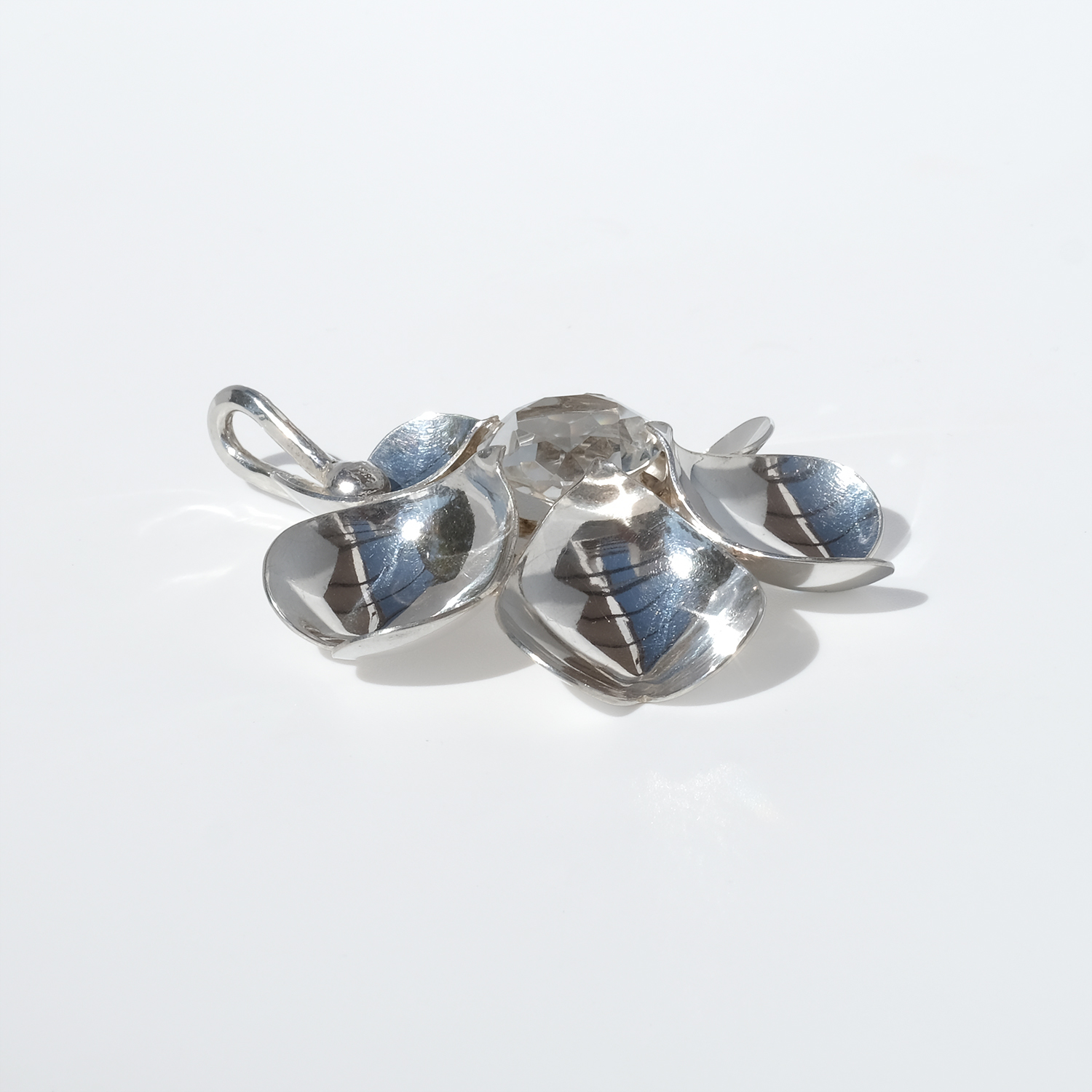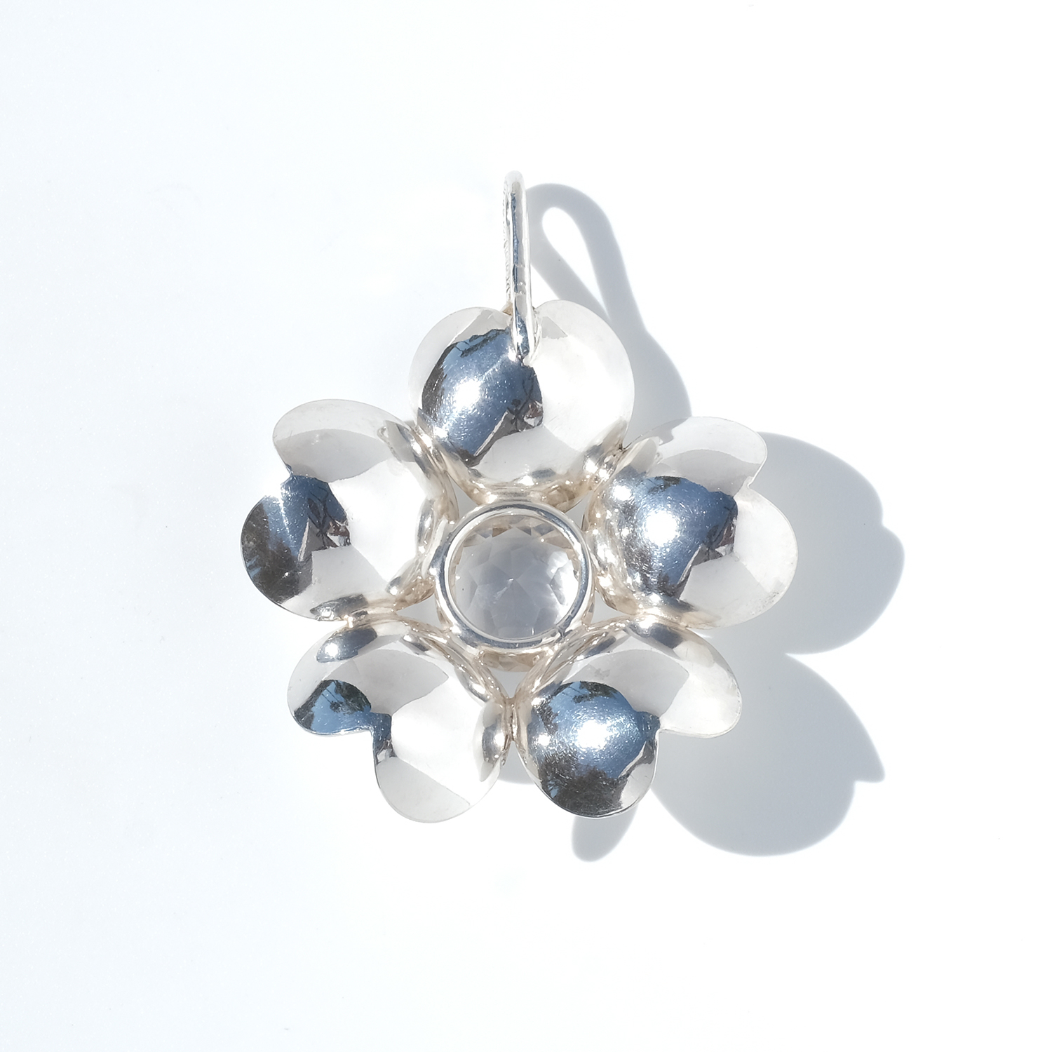 This vintage pendant is crafted in silver and designed with a clear sculptural focus. The pendant is shaped like an open flower, composed of five softly curved, petal-like forms. Each petal is hollowed and gently rounded, creating depth and light reflections across the surface. At the center sits a large faceted rock crystal, held in place with a simple, open setting that allows light to pass through the stone.