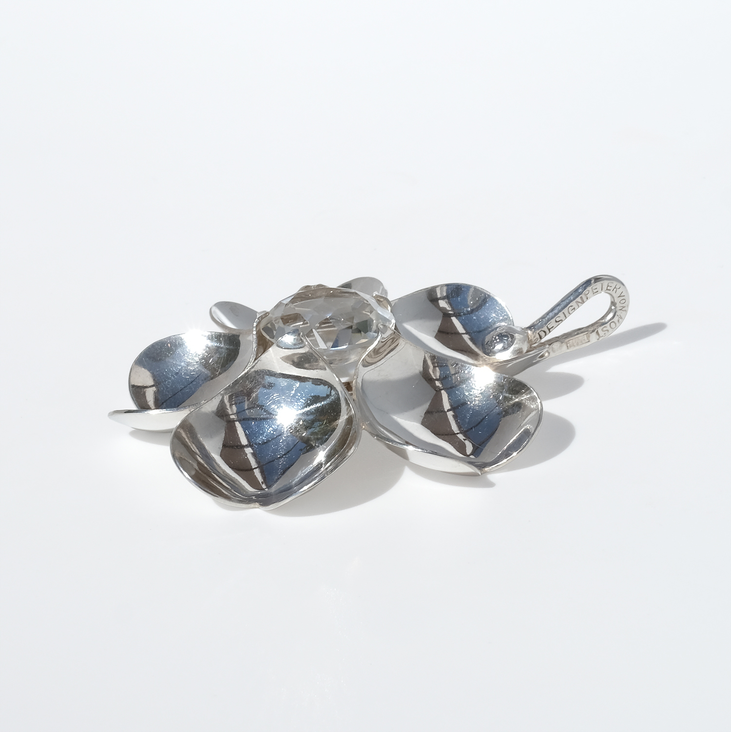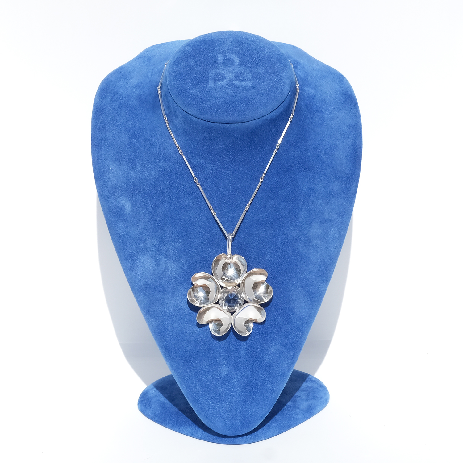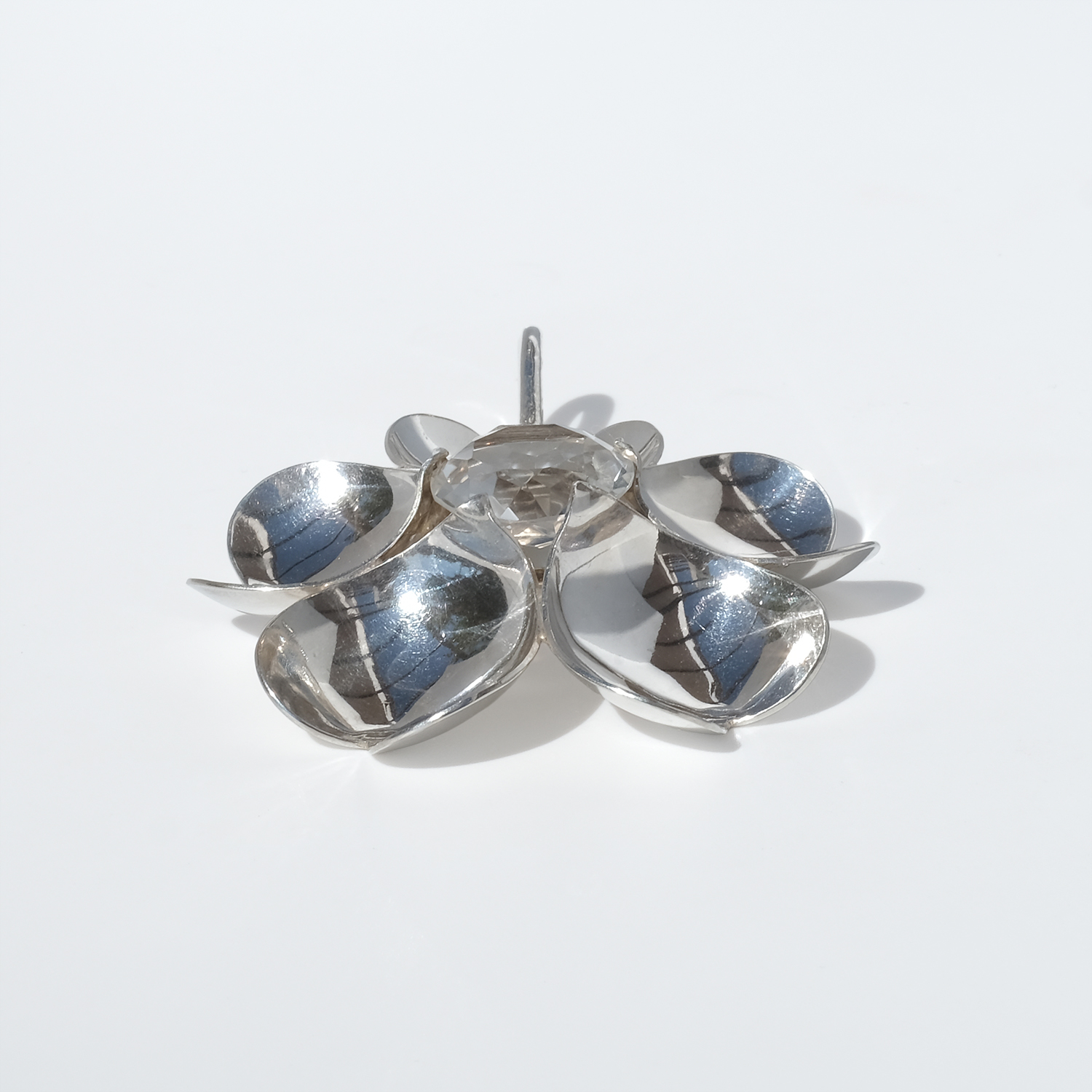 This vintage pendant is crafted in silver and designed with a clear sculptural focus. The pendant is shaped like an open flower, composed of five softly curved, petal-like forms. Each petal is hollowed and gently rounded, creating depth and light reflections across the surface. At the center sits a large faceted rock crystal, held in place with a simple, open setting that allows light to pass through the stone.