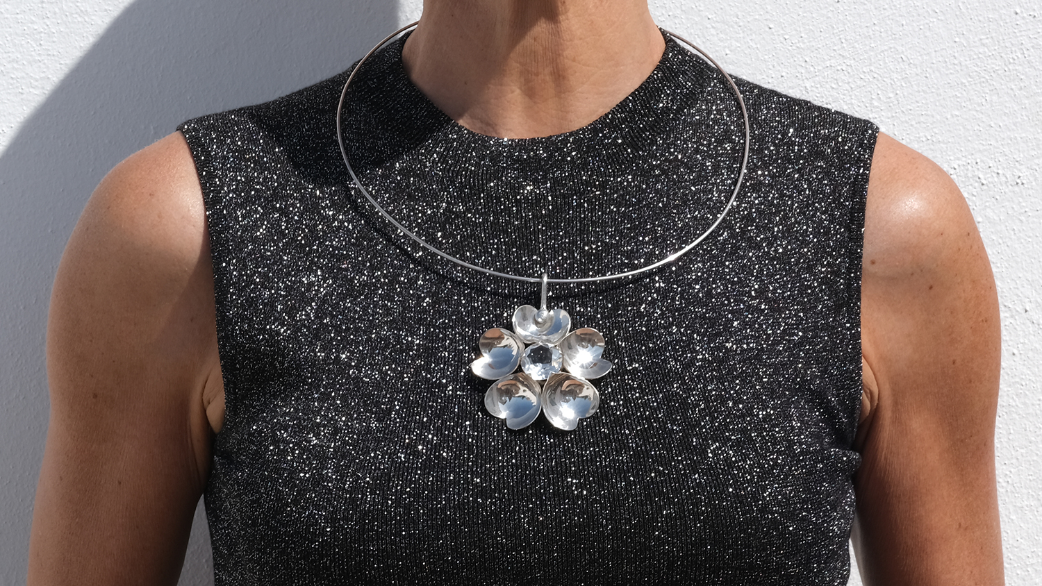 Worn, it has a distinct flower power feel—bold yet light, playful yet composed. The neck ring is included; the chain shown in one image is for styling purposes only, to illustrate an alternative way of wearing the pendant.
