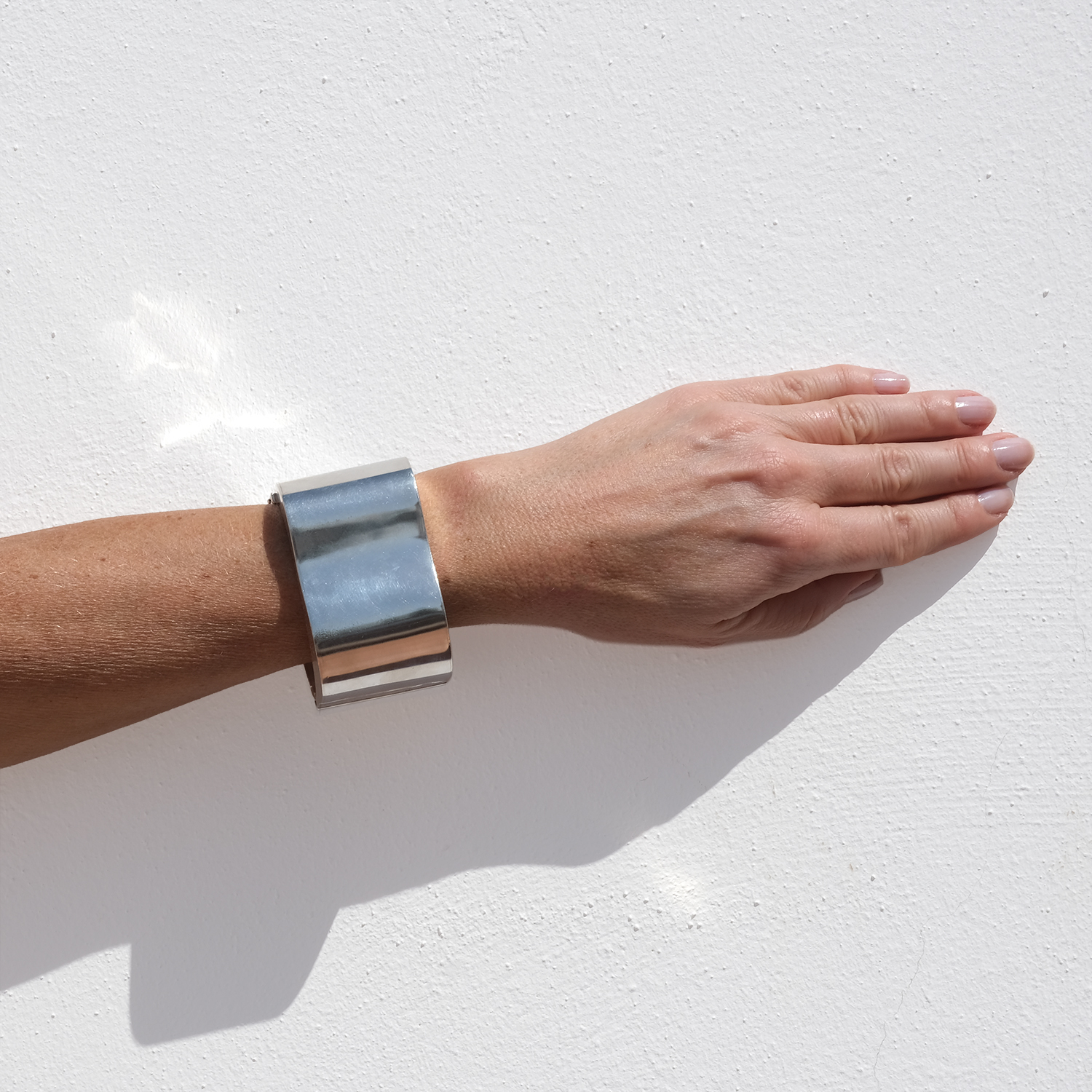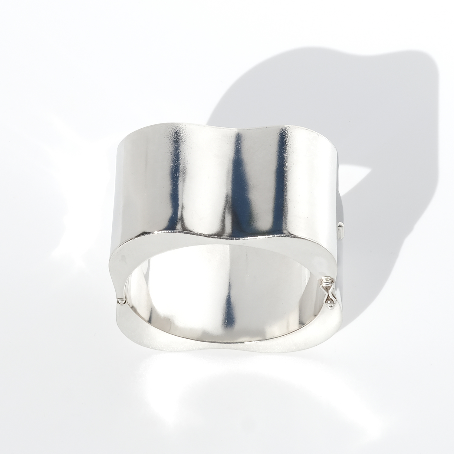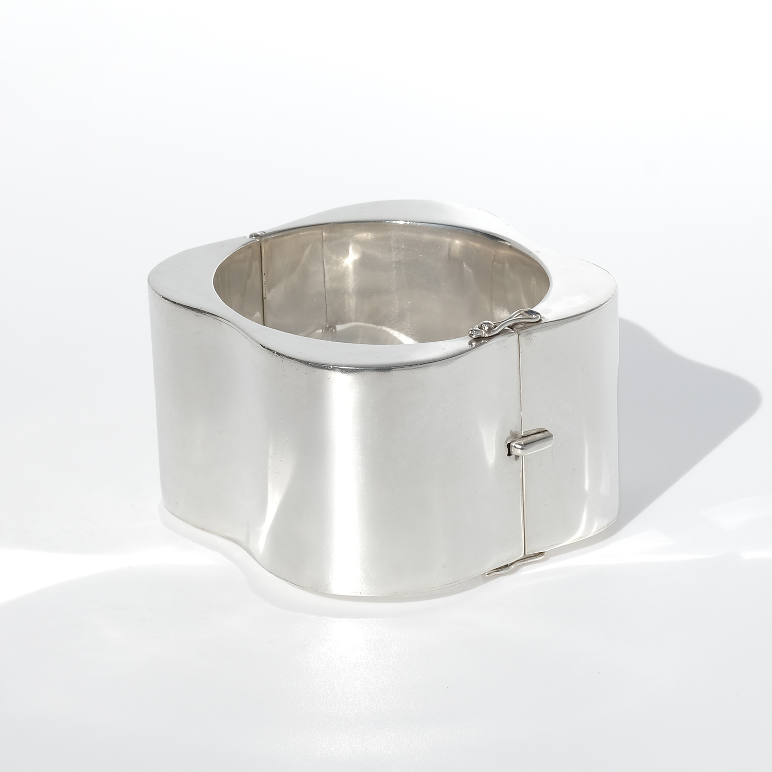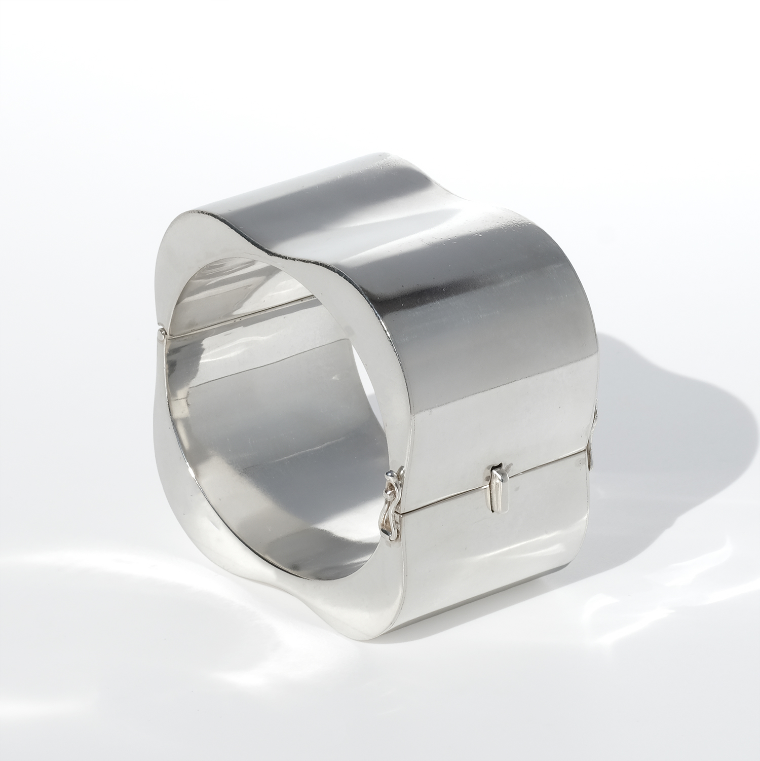 The surface is smooth and highly reflective, catching light in broad, shifting highlights that move with the wearer. Subtle curves soften the volume, creating a balanced contrast between strength and ease. It opens with a hinged box clasp and is secured with two side safety hooks, integrated into the design without interrupting the clean lines.
