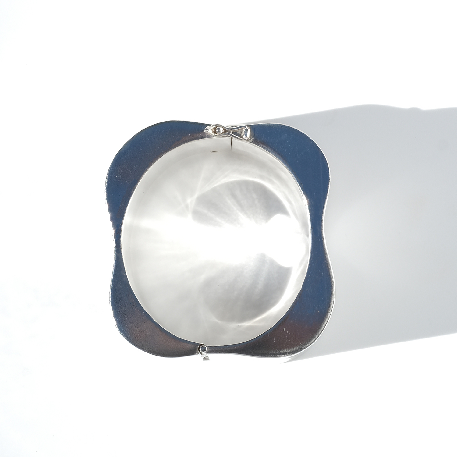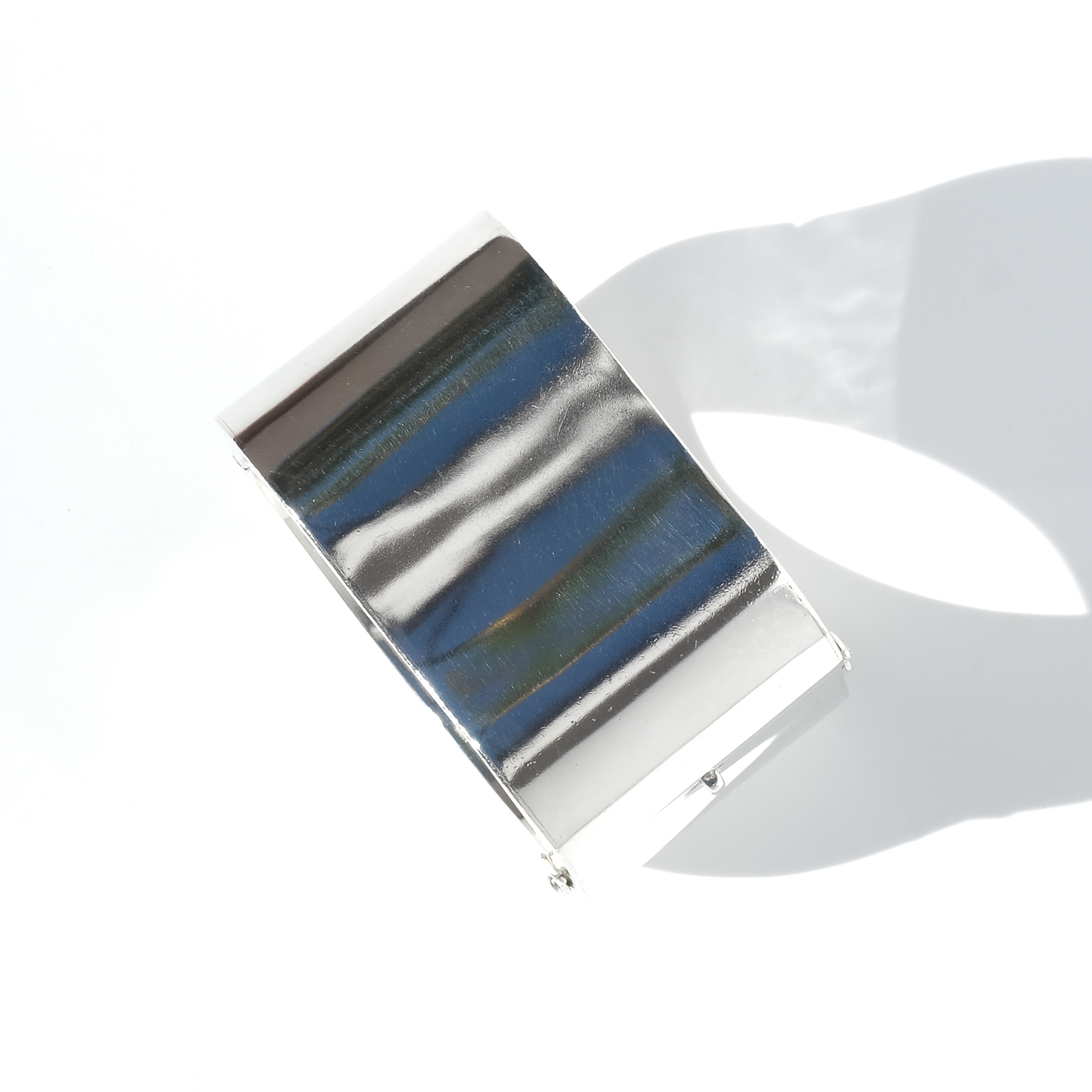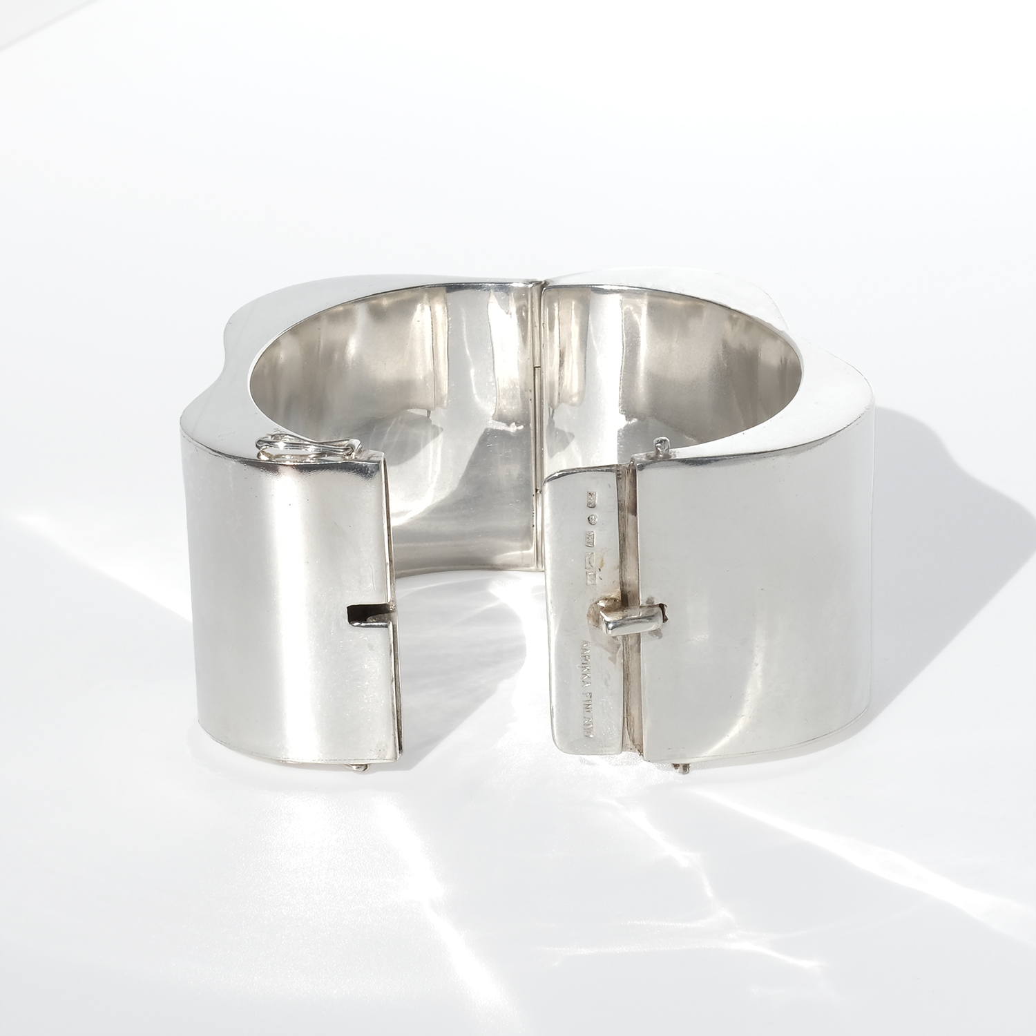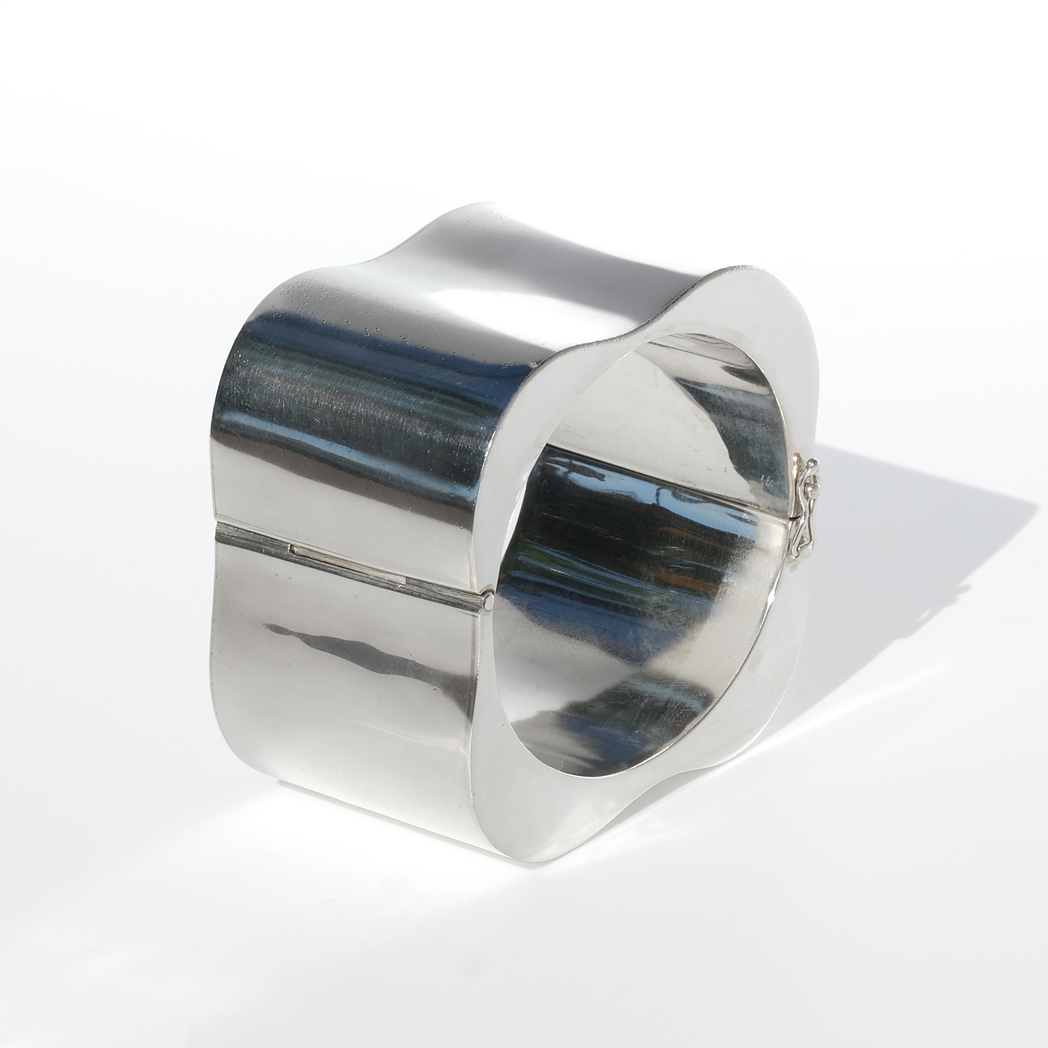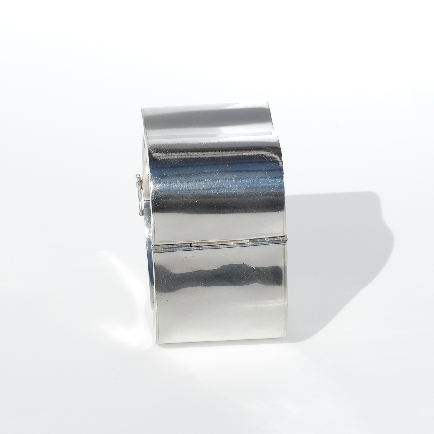 The surface is smooth and highly reflective, catching light in broad, shifting highlights that move with the wearer. Subtle curves soften the volume, creating a balanced contrast between strength and ease. It opens with a hinged box clasp and is secured with two side safety hooks, integrated into the design without interrupting the clean lines.