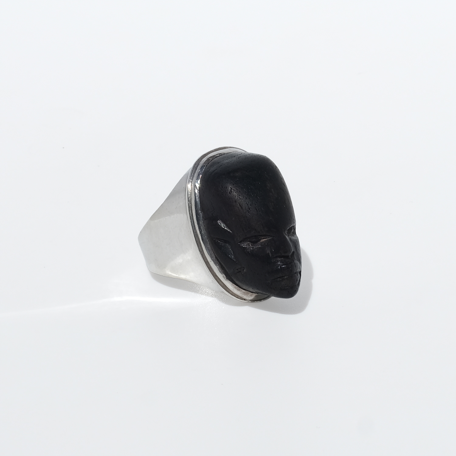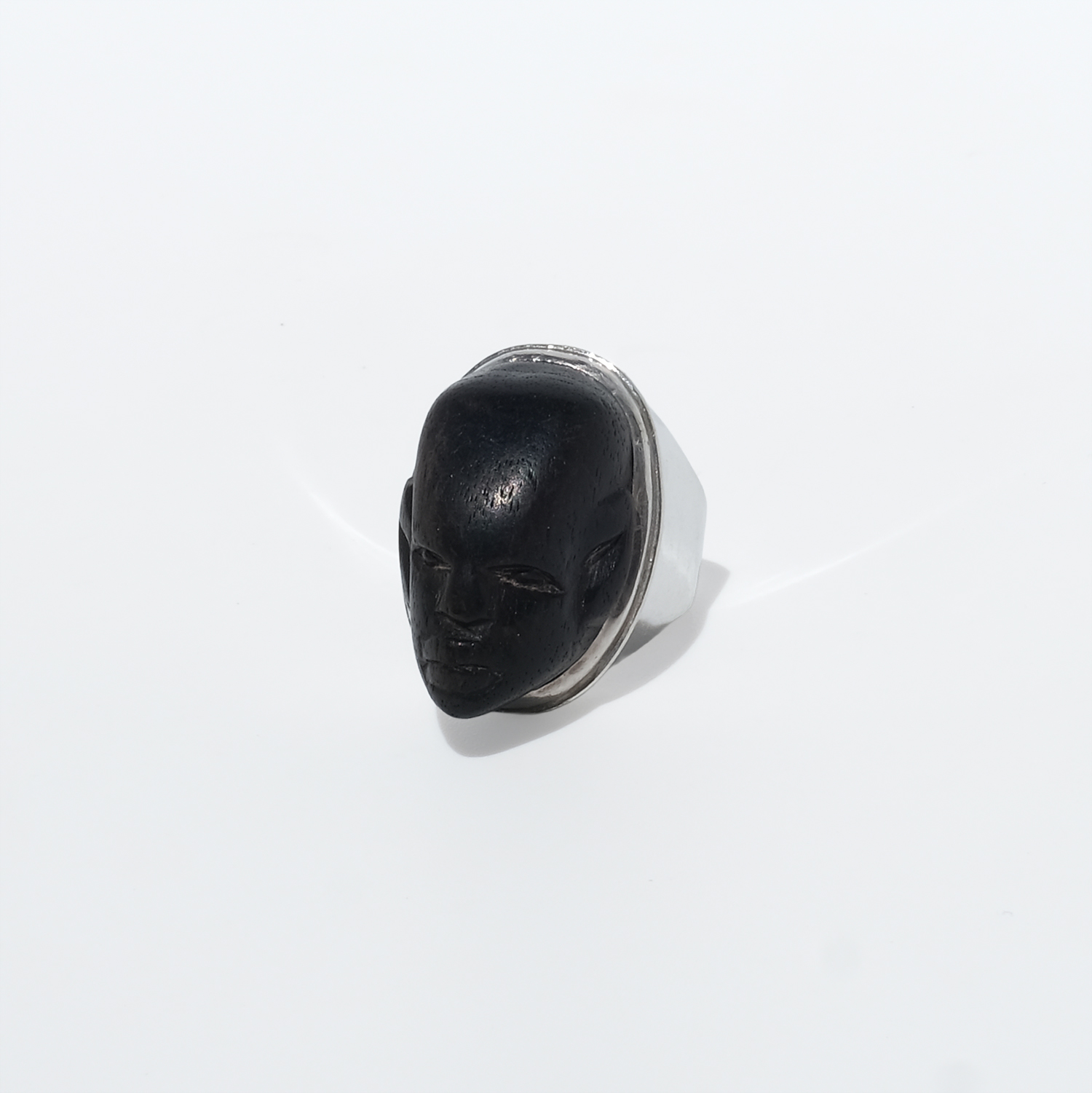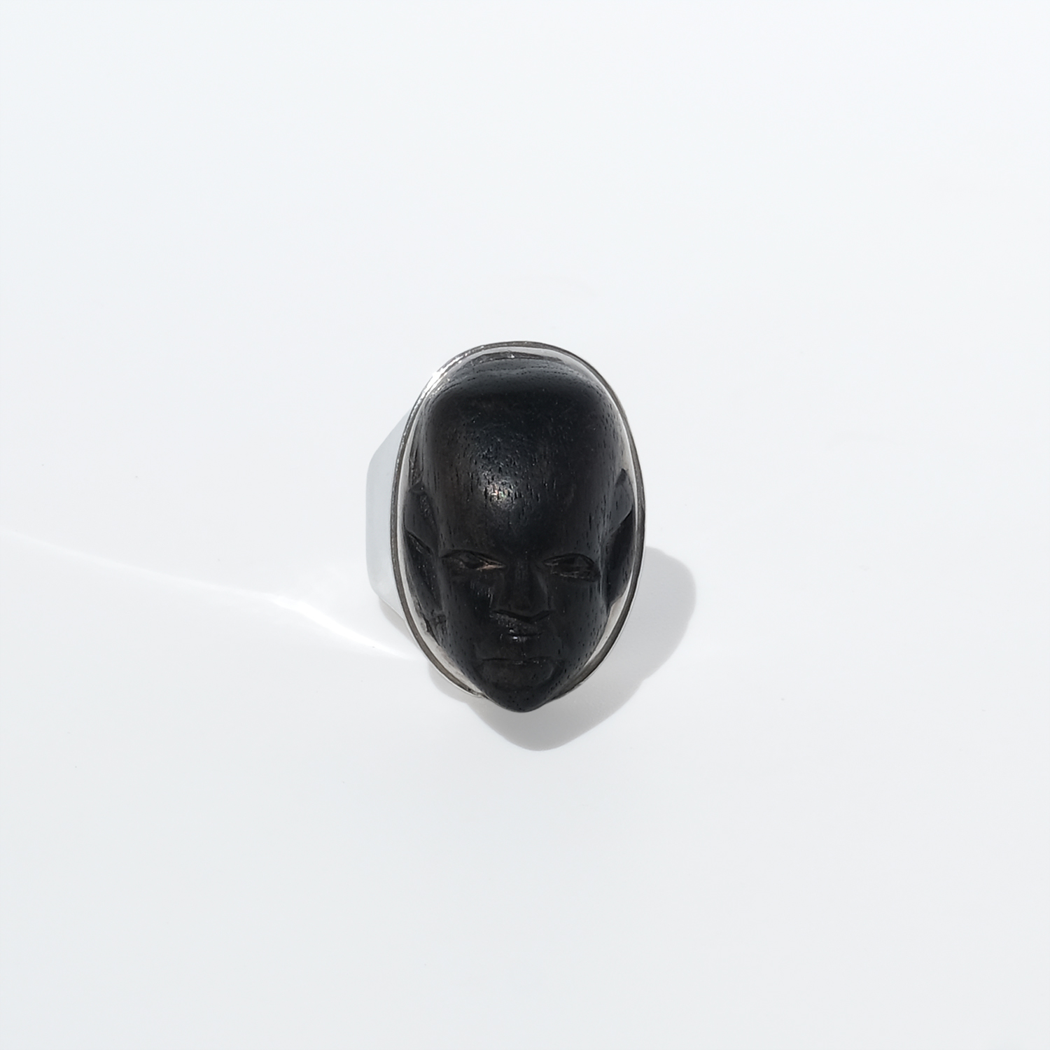 This striking ring pairs a carved wooden face with a solid silver mount. The head is elongated and oval, with a deep black-brown tone and a smooth, softly polished surface that lets the carved features stand out: almond-shaped eyes, a straight nose, defined lips, and a calm, steady expression. A fine silver border frames the face, while the heavy silver shank rises broadly at the shoulders and continues in a solid, even width toward the back, giving the ring both balance and presence.
