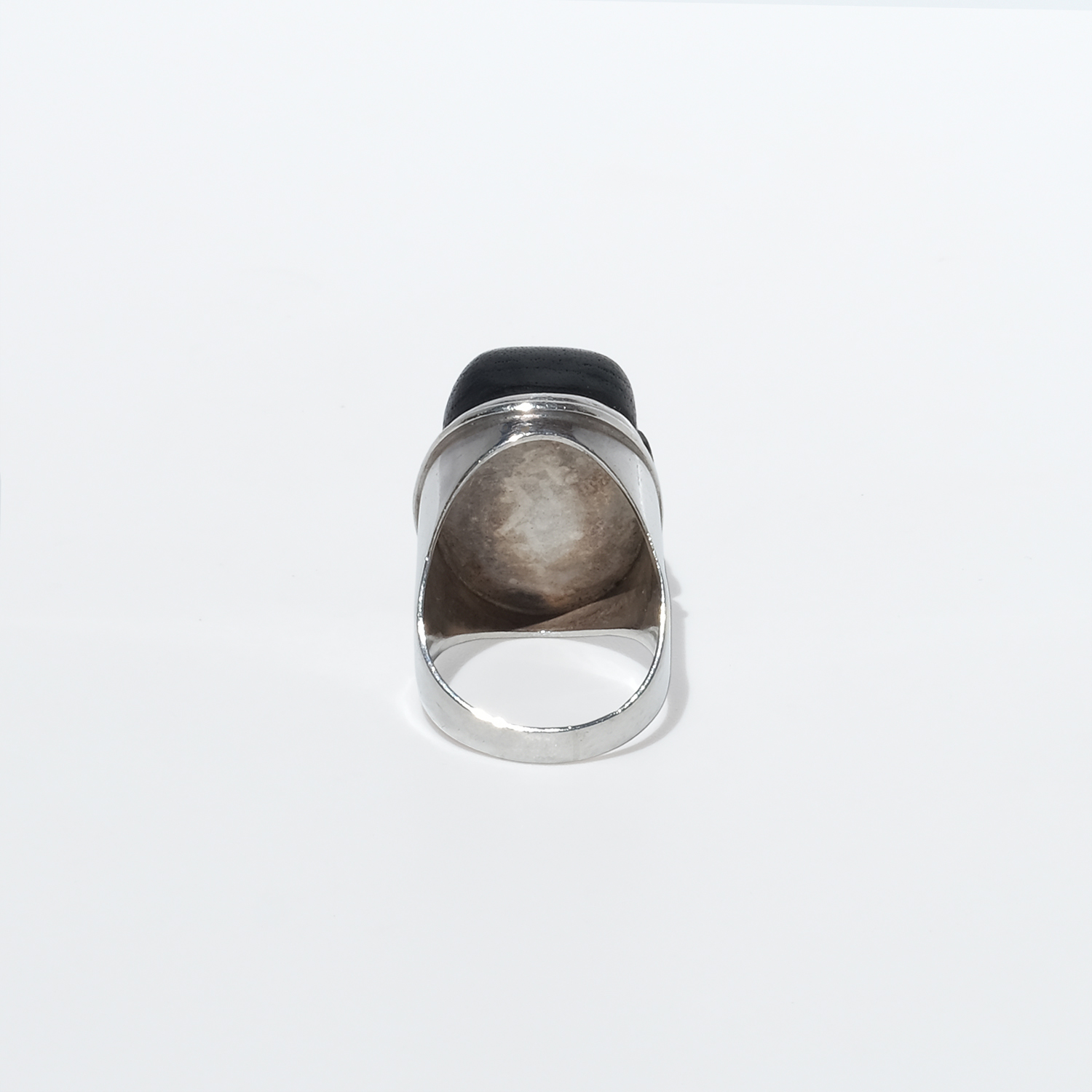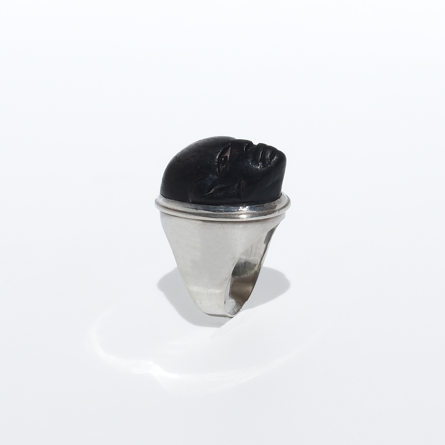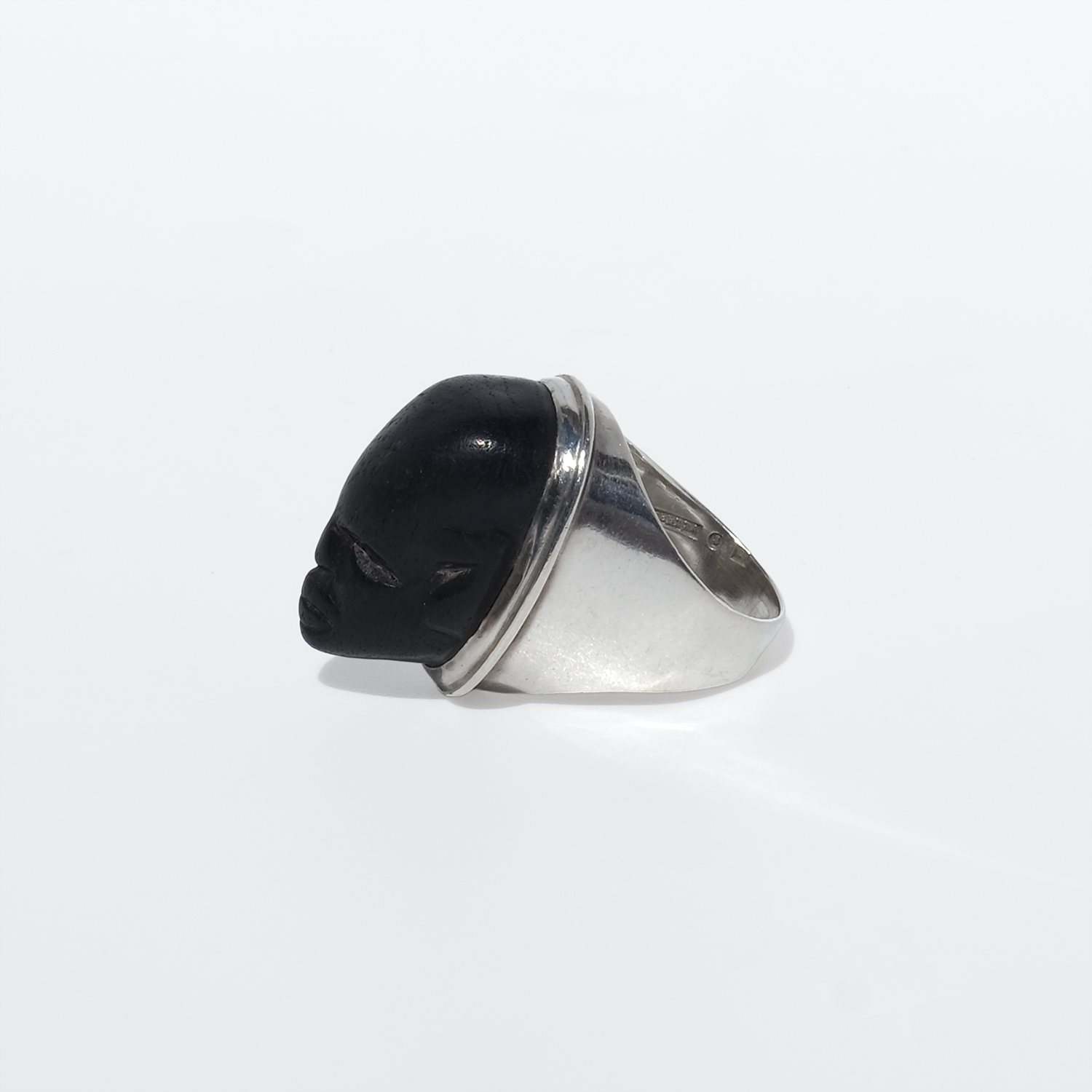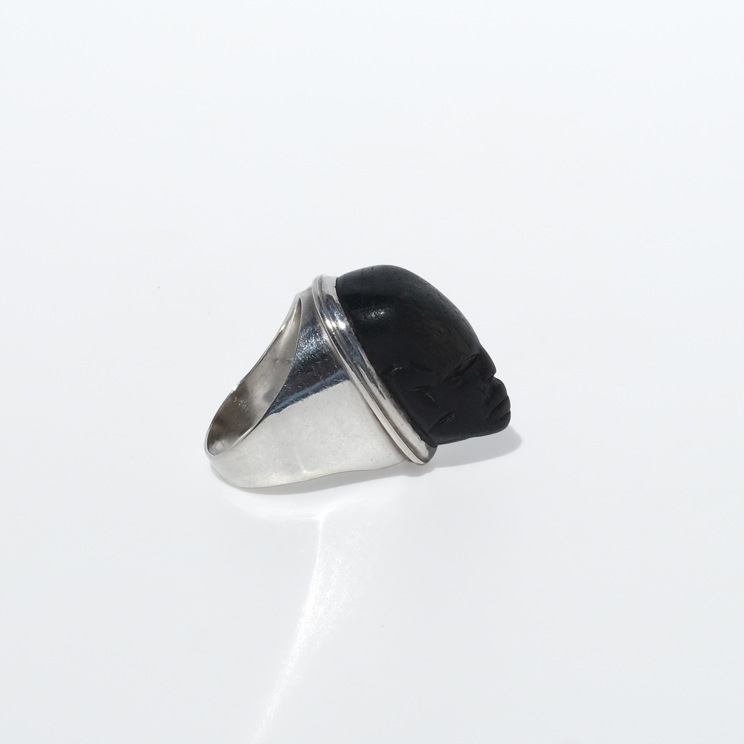 This striking ring pairs a carved wooden face with a solid silver mount. The head is elongated and oval, with a deep black-brown tone and a smooth, softly polished surface that lets the carved features stand out: almond-shaped eyes, a straight nose, defined lips, and a calm, steady expression. A fine silver border frames the face, while the heavy silver shank rises broadly at the shoulders and continues in a solid, even width toward the back, giving the ring both balance and presence.