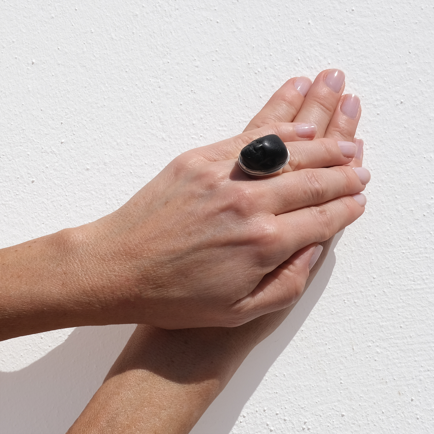 On the hand, it sits like a small sculpture. Bold, direct, and slightly mysterious, it has the kind of character that carries a simple outfit on its own. A ring for days when one piece is enough.