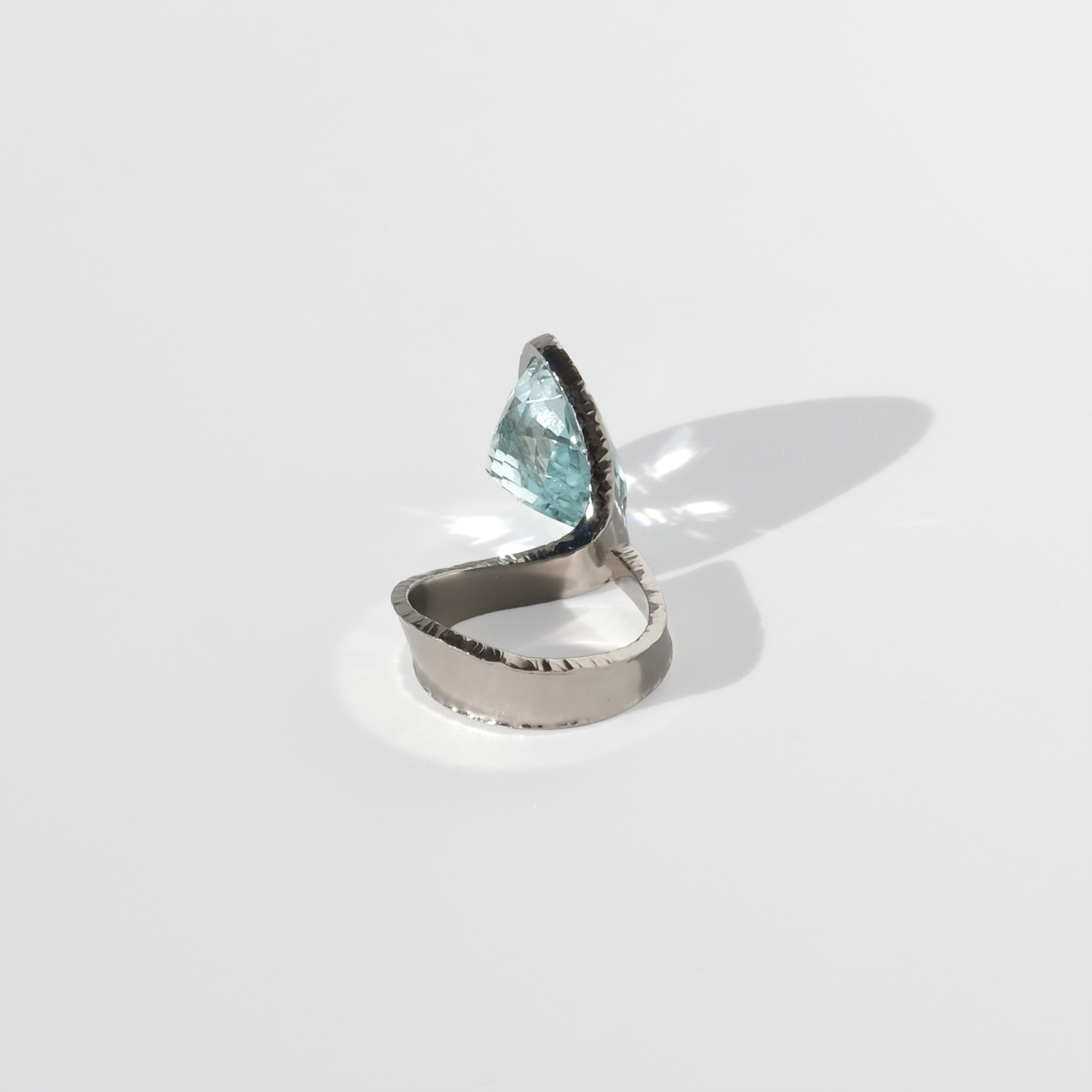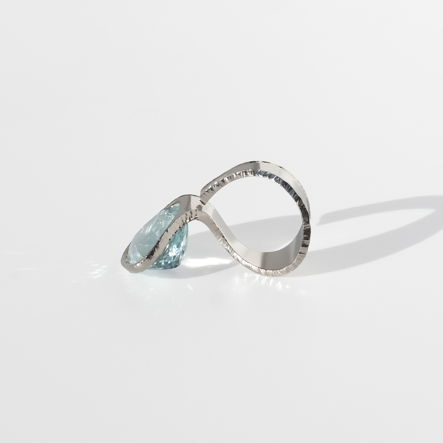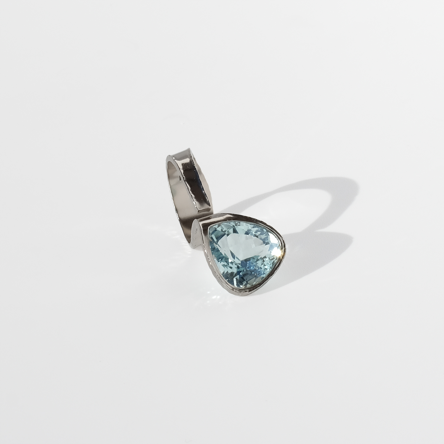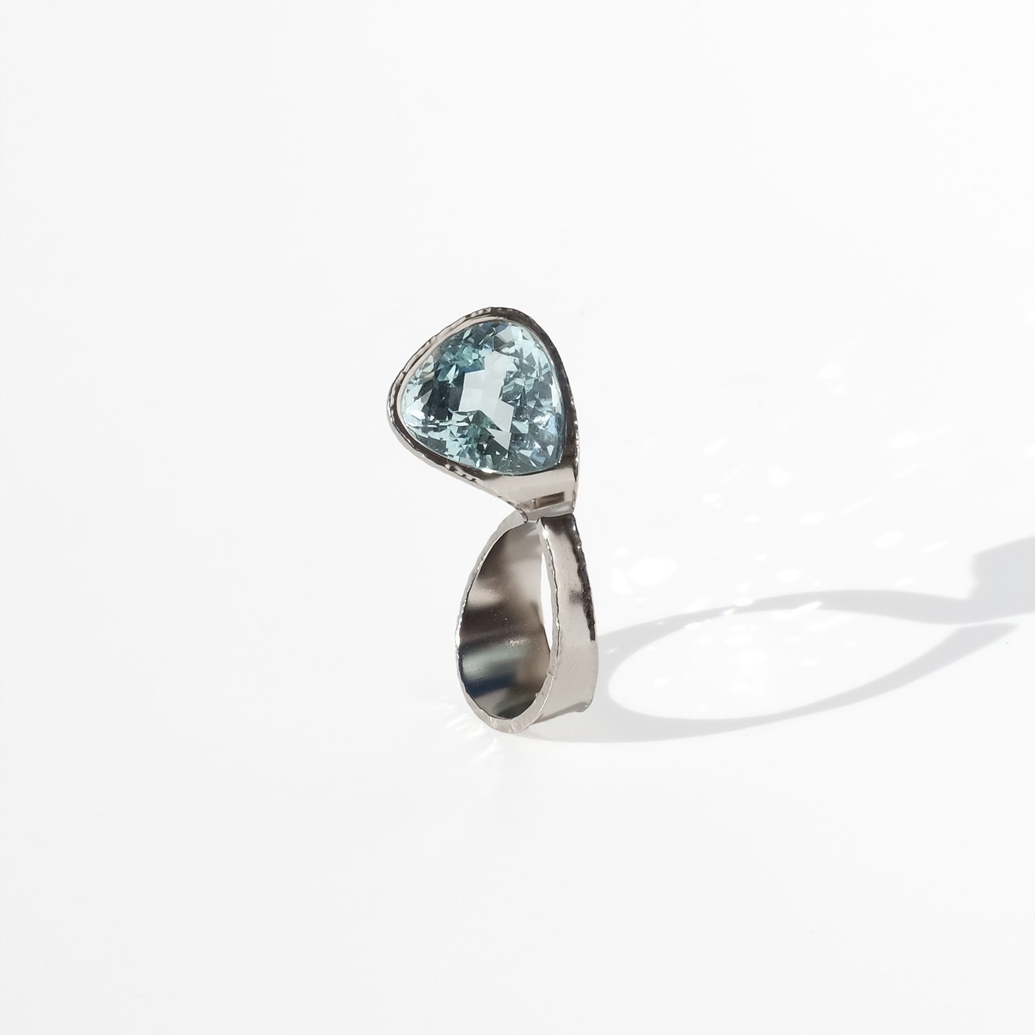 This white-gold ring is set with a faceted aquamarine in a soft, watery blue. Seen from above, the stone has an organic, slightly asymmetrical triangular outline; from the side, its pavilion is clearly visible, rising high above the finger and catching the light with depth and clarity. The aquamarine is held in a smooth, sculptural bezel that follows the stone’s irregular contour and frames it with quiet precision. The shank is expressive, changing in thickness as it twists gently around the finger.
