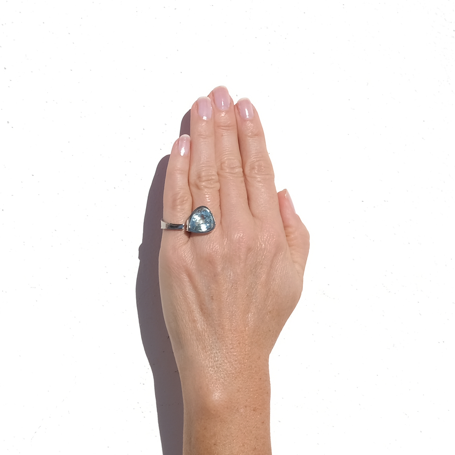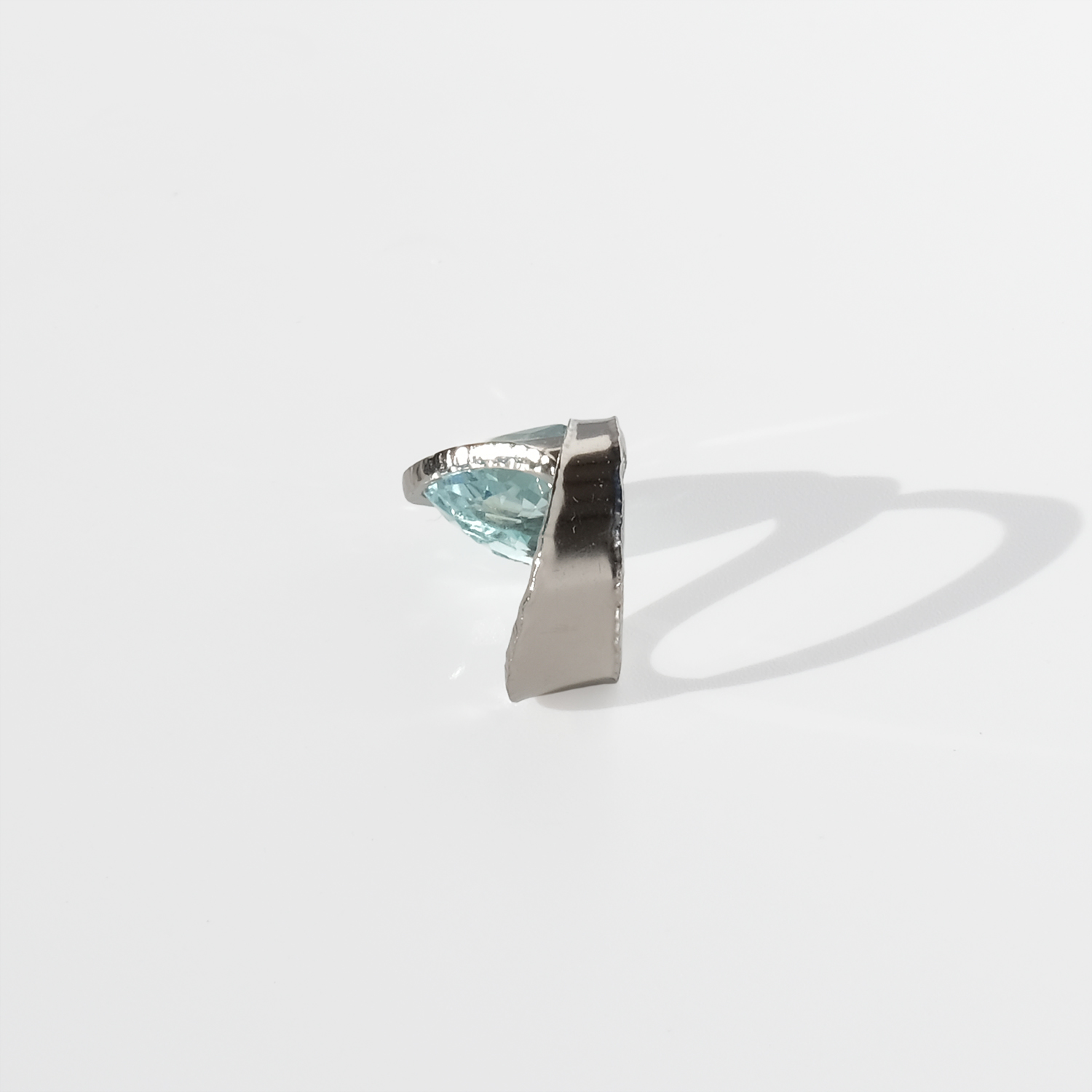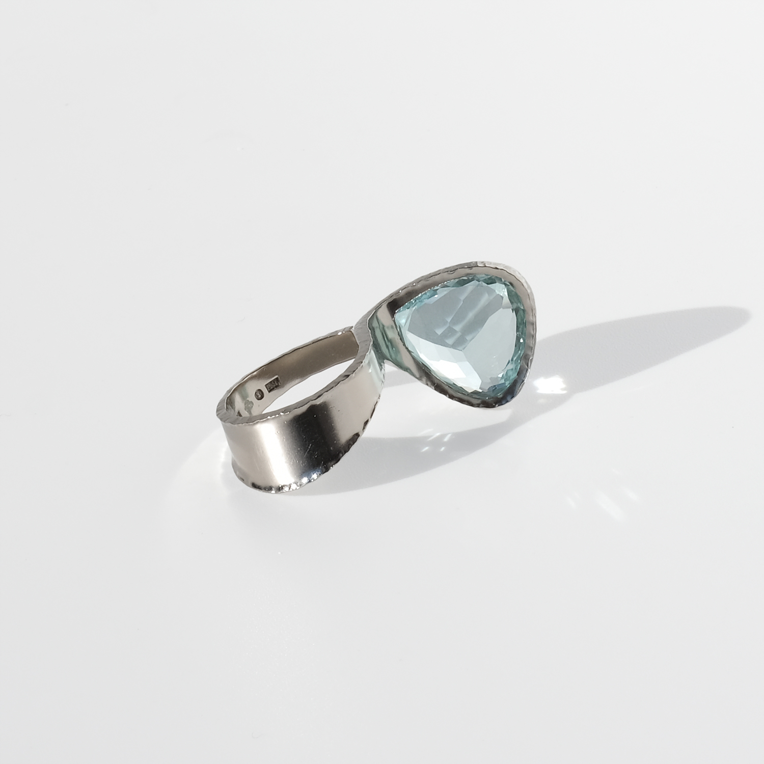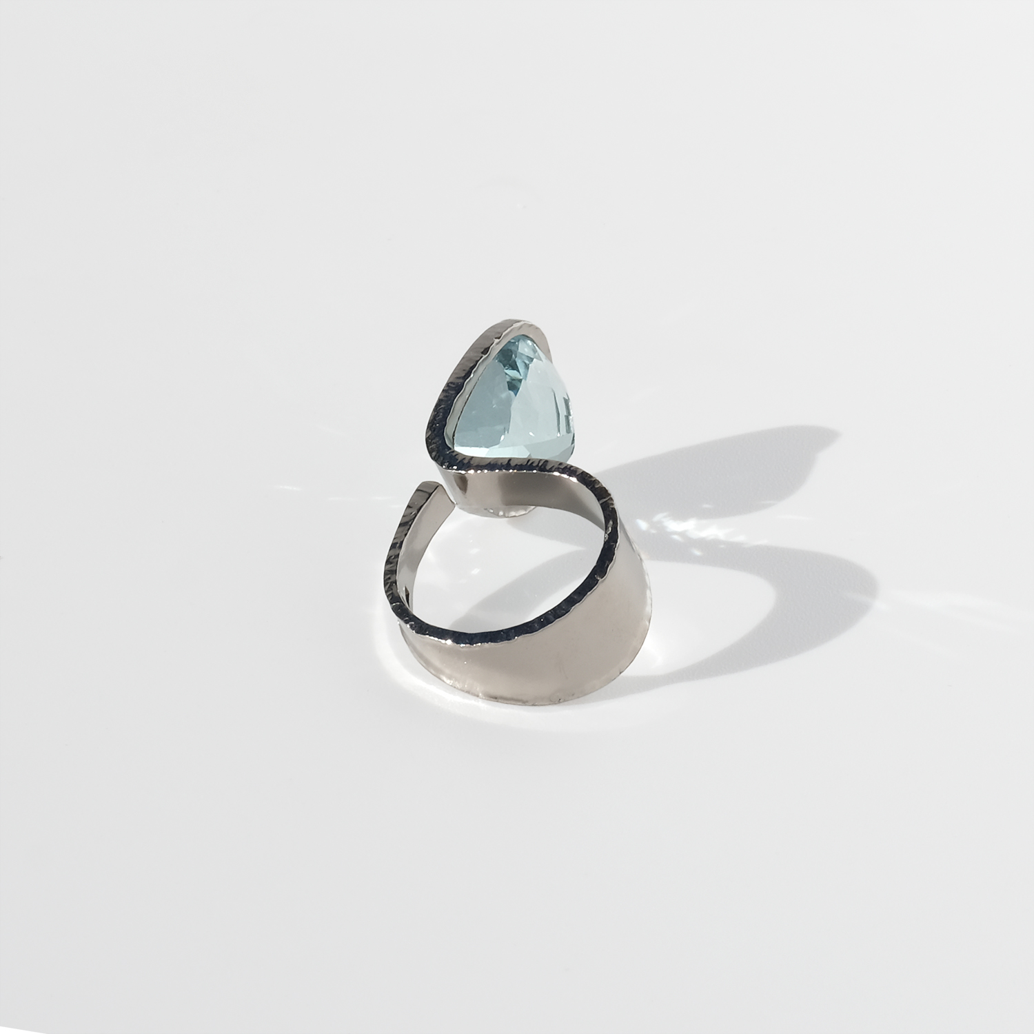 This white-gold ring is set with a faceted aquamarine in a soft, watery blue. Seen from above, the stone has an organic, slightly asymmetrical triangular outline; from the side, its pavilion is clearly visible, rising high above the finger and catching the light with depth and clarity. The aquamarine is held in a smooth, sculptural bezel that follows the stone’s irregular contour and frames it with quiet precision. The shank is expressive, changing in thickness as it twists gently around the finger.