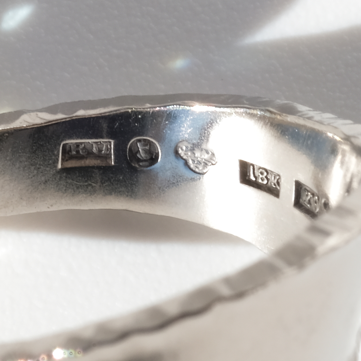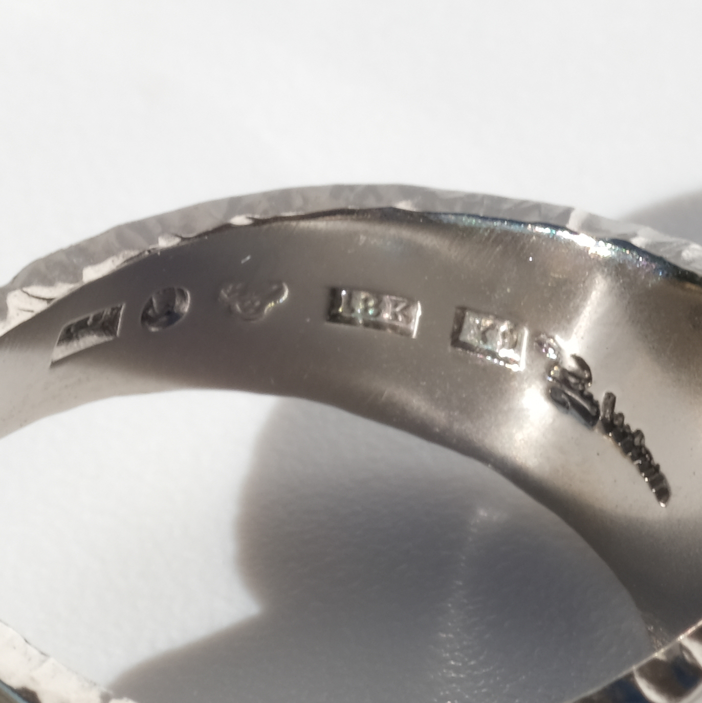 Its flowing form creates a subtle sense of movement, while the edges are deliberately worked, leaving a lightly textured finish that contrasts with the polished surfaces. Worn on the hand, the ring feels bold yet balanced — sculptural, confident, and unmistakably modern, with a strong presence that remains elegant rather than heavy.